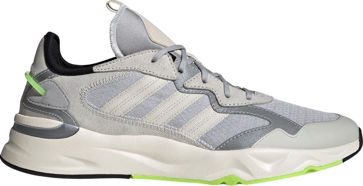 De beige met grijze Futureflow sneakers van adidas combineren een casual streetwear-look met een flinke dosis op hardlopen geïnspireerde performance en stijl. De grove zool biedt een comfortabele demping, het mesh bovenwerk zorgt voor ventilatie en de felgroene en reflecterende details zorgen voor een opvallende look.