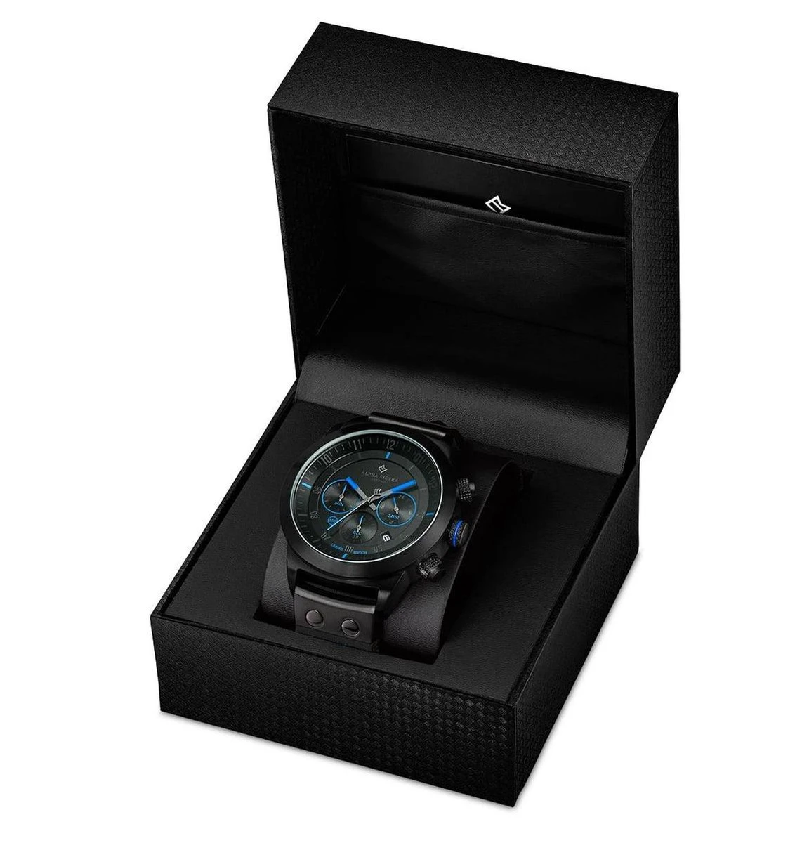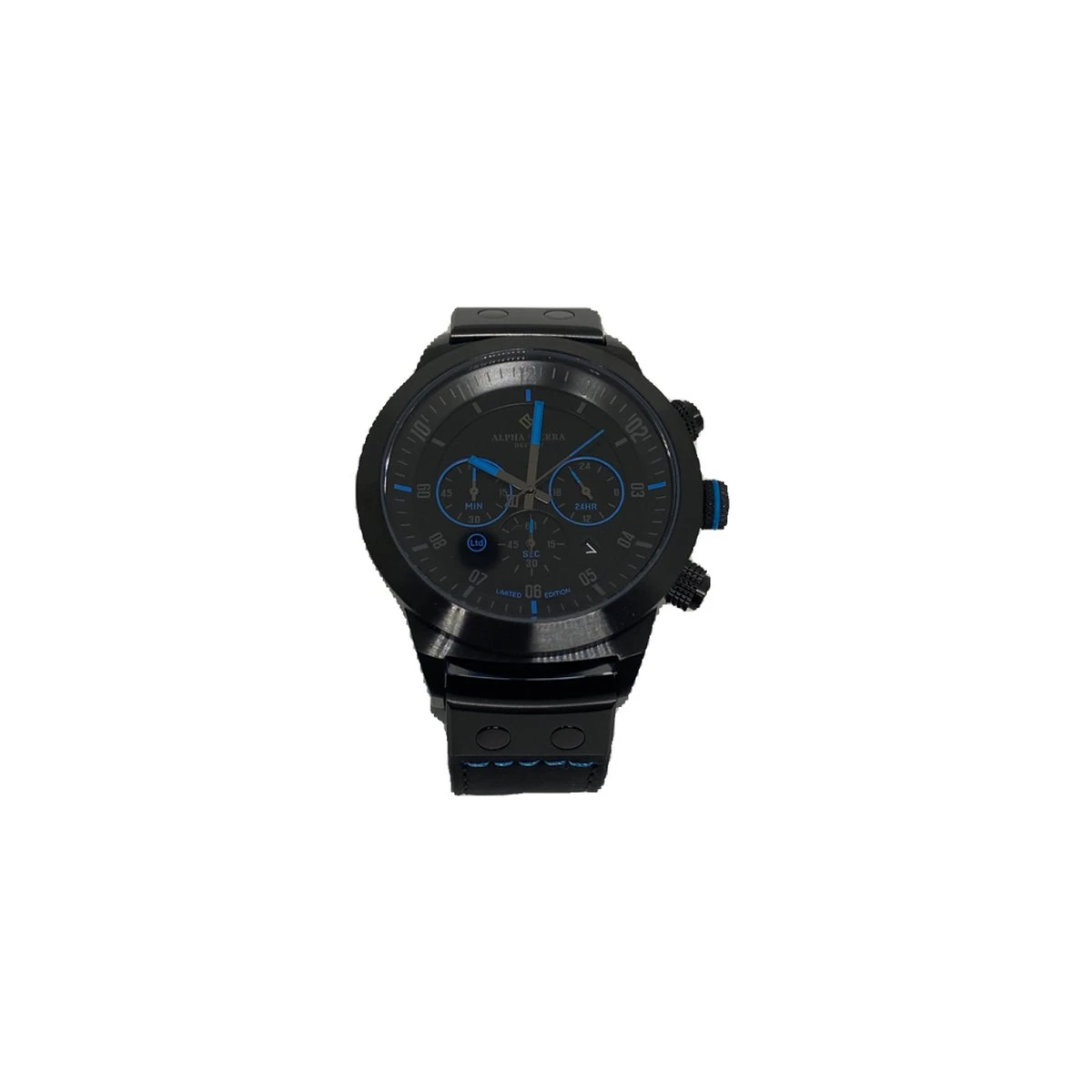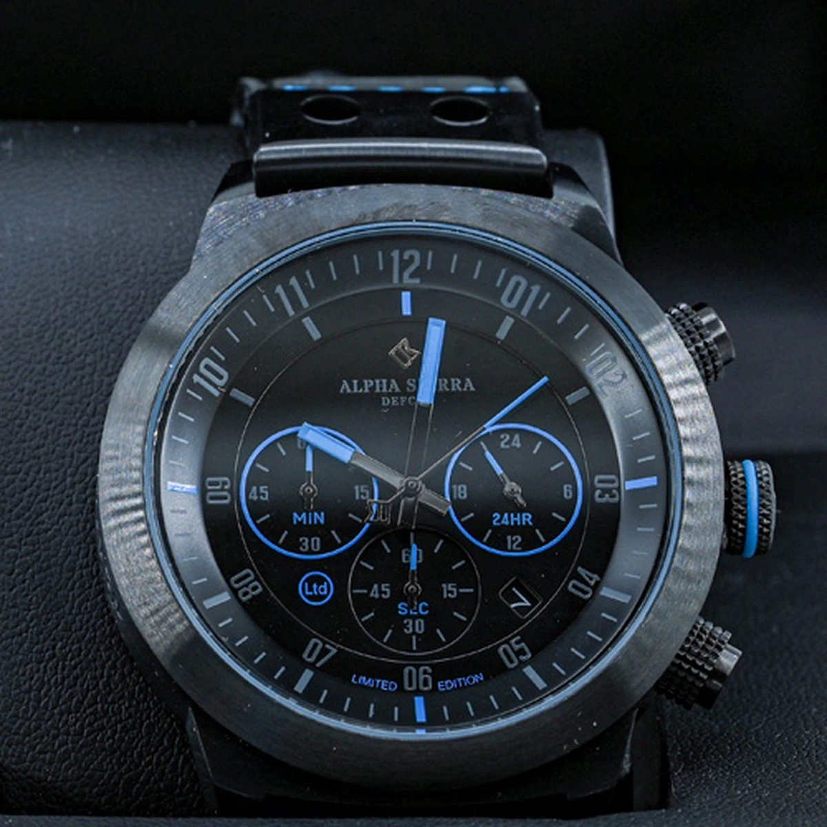 Dit Alpha Sierra Defcon LGM36BL herenhorloge heeft blauwe accenten op de wijzerplaat en in de leren band. Er zijn slechts 1959 stuks van dit model gemaakt.