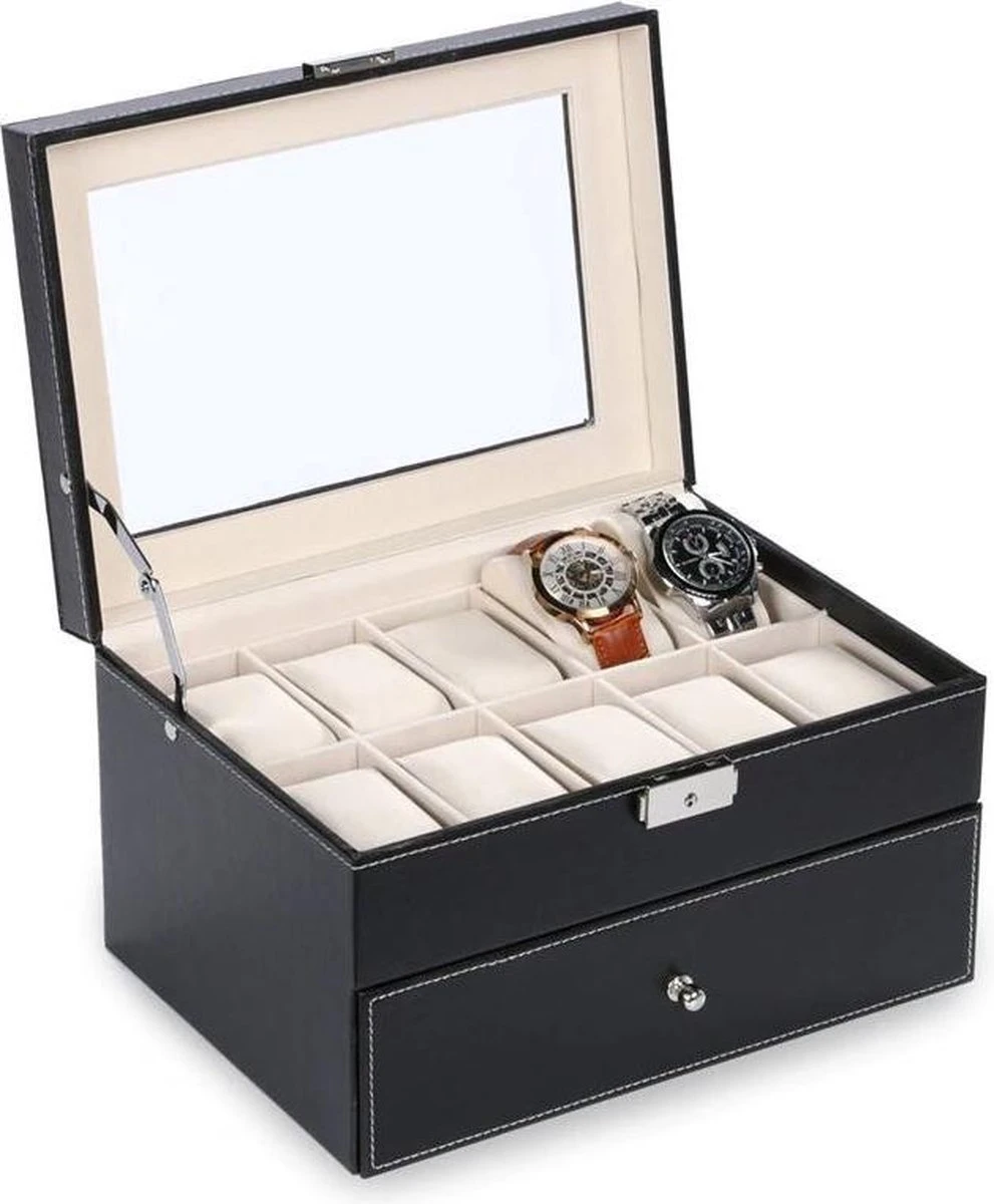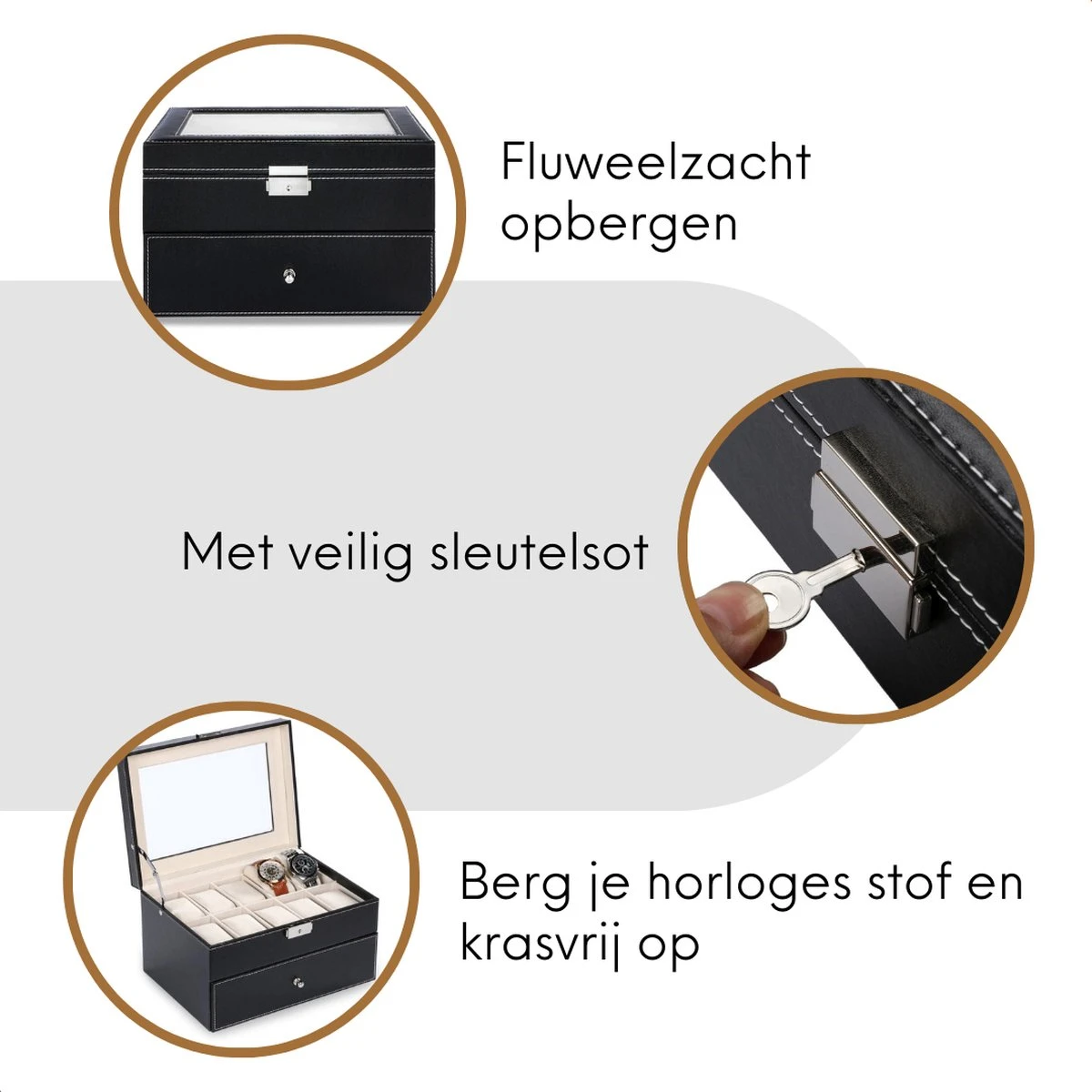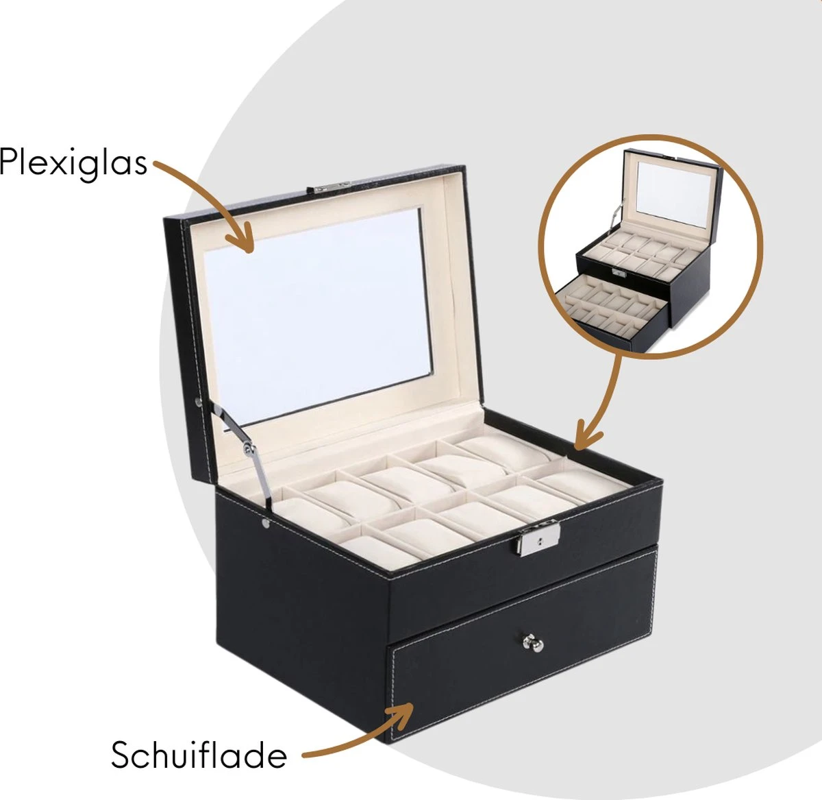 Met de Aretica horlogebox 20 stuks plaats je eenvoudig je dure horloges op. Deze horlogebox mag niet aan je collectie missen. Sterker nog: Hierin berg je alle horloges op, ze blijven in alle veiligheid bewaard. Plaats de horloges met de wijzerplaat naar boven, zo ogen ze het mooist. Voor diegene die hun collectie graag bewonderen (Schaam je er niet voor). De bovenkant van de box is voorzien van plexiglas. Ronduit handig: Je kan ten alle tijden naar jouw prachtige horloges kijken, of laten kijken. Misschien ben je niet zo’n horloge fan,dat kan. Ben je eerder iemand waarbij de sieradendoos uitpuilt met armbanden? Los met de opbergdoos ook dit probleem op. Door jouw armbanden om de kussentjes te doen, blijven ze in vorm bewaard.