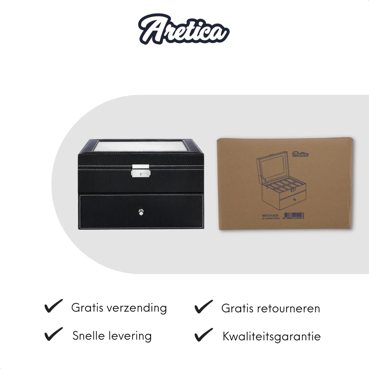 De afmetingen van de box zijn 20 x 28,5 x 16,5 cm (lxbxh). Met een afsluiting om U tegen te zeggen. De Aretica horlogebox is perfect voor eigen gebruik, maar ook om cadeau te geven.