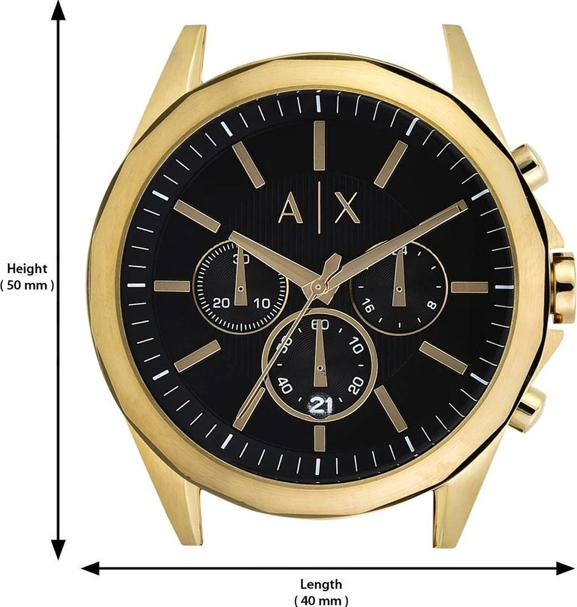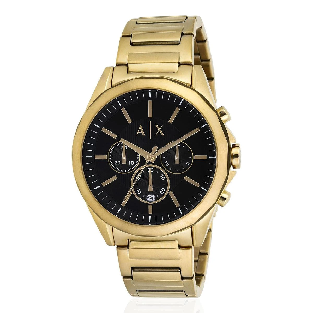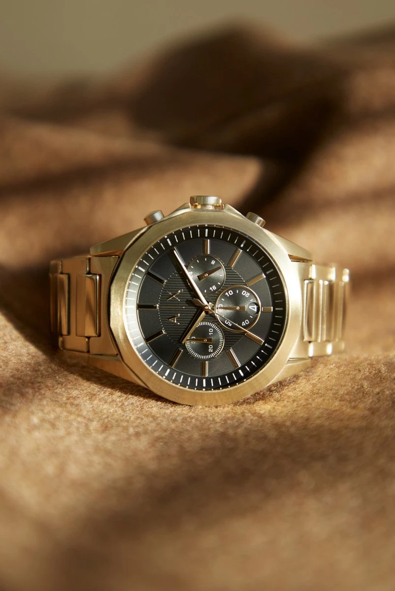 Dit originele Armani Exchange horloge brengt een klassieke chronograaf samen met een strakke zwarte wijzerplaat binnen een moderne goudkleurige kast.