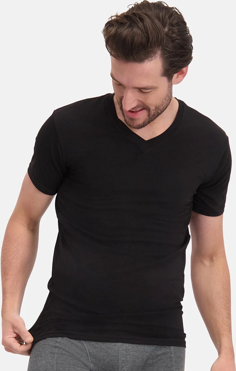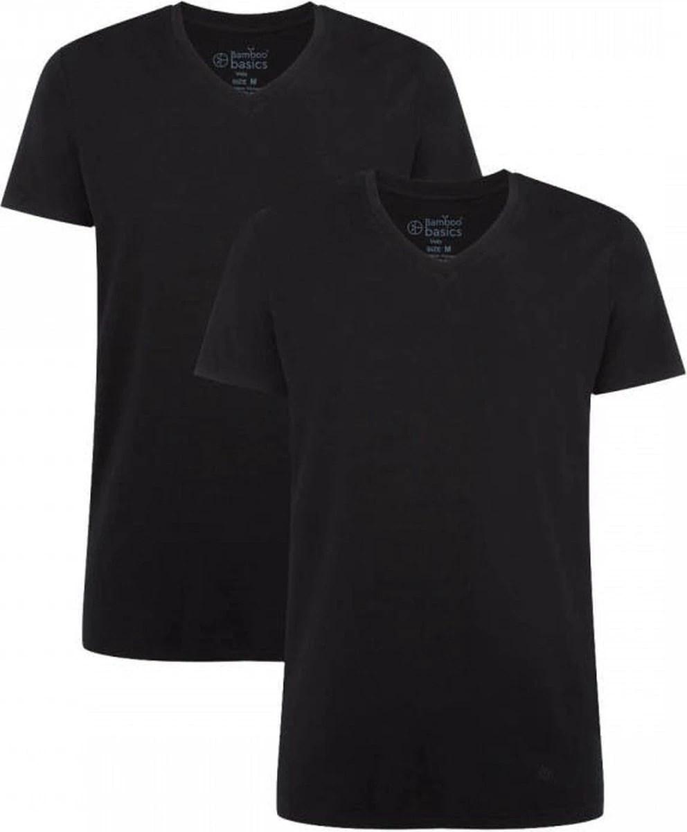 Zoek niet verder, dit is jouw nieuwe favoriete basic T-shirt! Deze set bevat twee zwarte Bamboo Basics T-shirts met V-hals. De bamboe shirts zitten geweldig door de zijdezachte stof en zijn te dragen onder een overhemd, maar ook als casual T-shirt. Voel je gegarandeerd de hele dag fris door de fijne eigenschappen van bamboe! Perfecte fit Extra lang Zijdezacht Thermo comfort Dit model is 187 cm en draagt maat M.