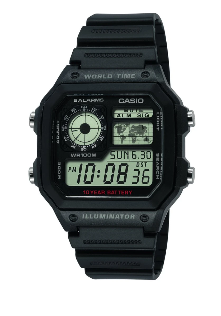 De World Time collectie van Casio bestaat uit modieuze horloges voor heren met smaak. Dit horloge heeft een stijlvolle band en de kast van het horloge is met zorg afgewerkt. De Casio World Time is zwart van kleur en de horlogekast heeft een afmeting van 42.1 mm. Het bandje van het horloge is gemaakt van hoge kwaliteit Plastic / Resin. Zwart digitaal horloge met kunsthars band.