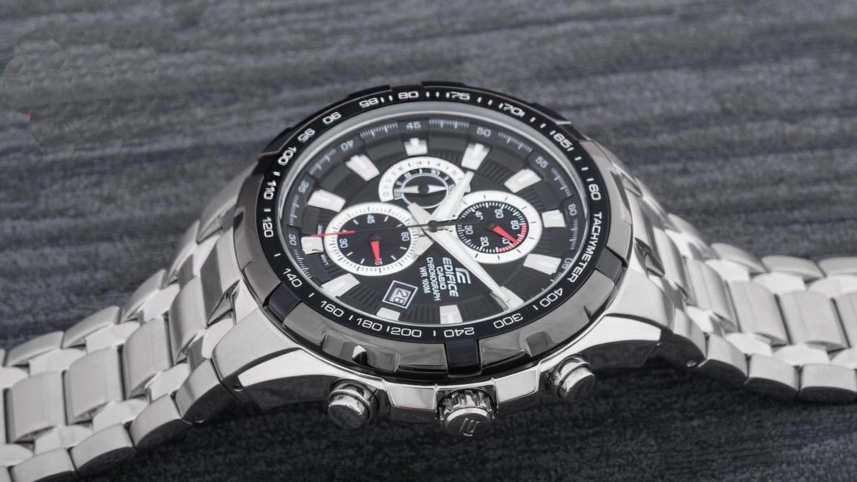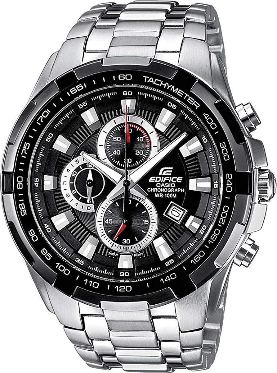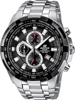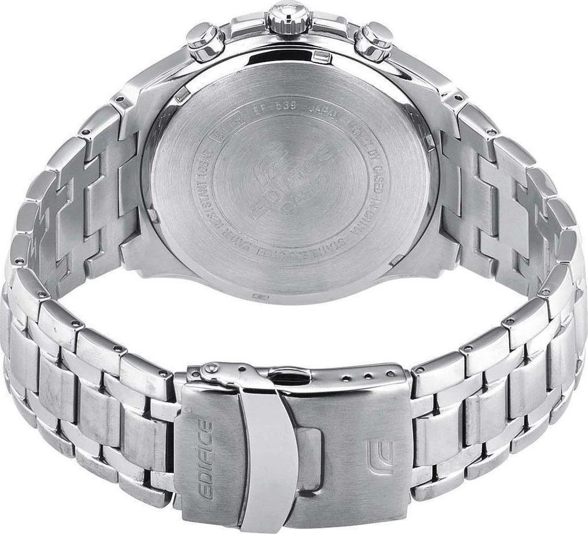 Deze Casio EF-539D-1AVEF heeft een horlogekast gemaakt van Roestvrij Staal en de band is van Roestvrij Staal. De tijd wordt Analoog weergegeven. Het heeft een Mineraal horlogeglas en een Quartz uurwerk. De wijzerplaat is Zwart, en de band Zilver. Het horloge is 10 bar (zwemmen) waterdicht. Het horloge wordt voornamelijk gedragen door Mannen.