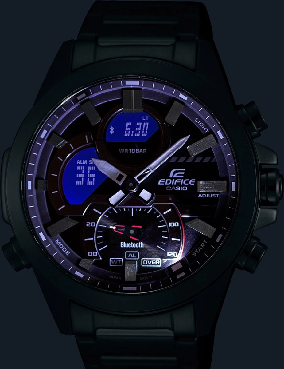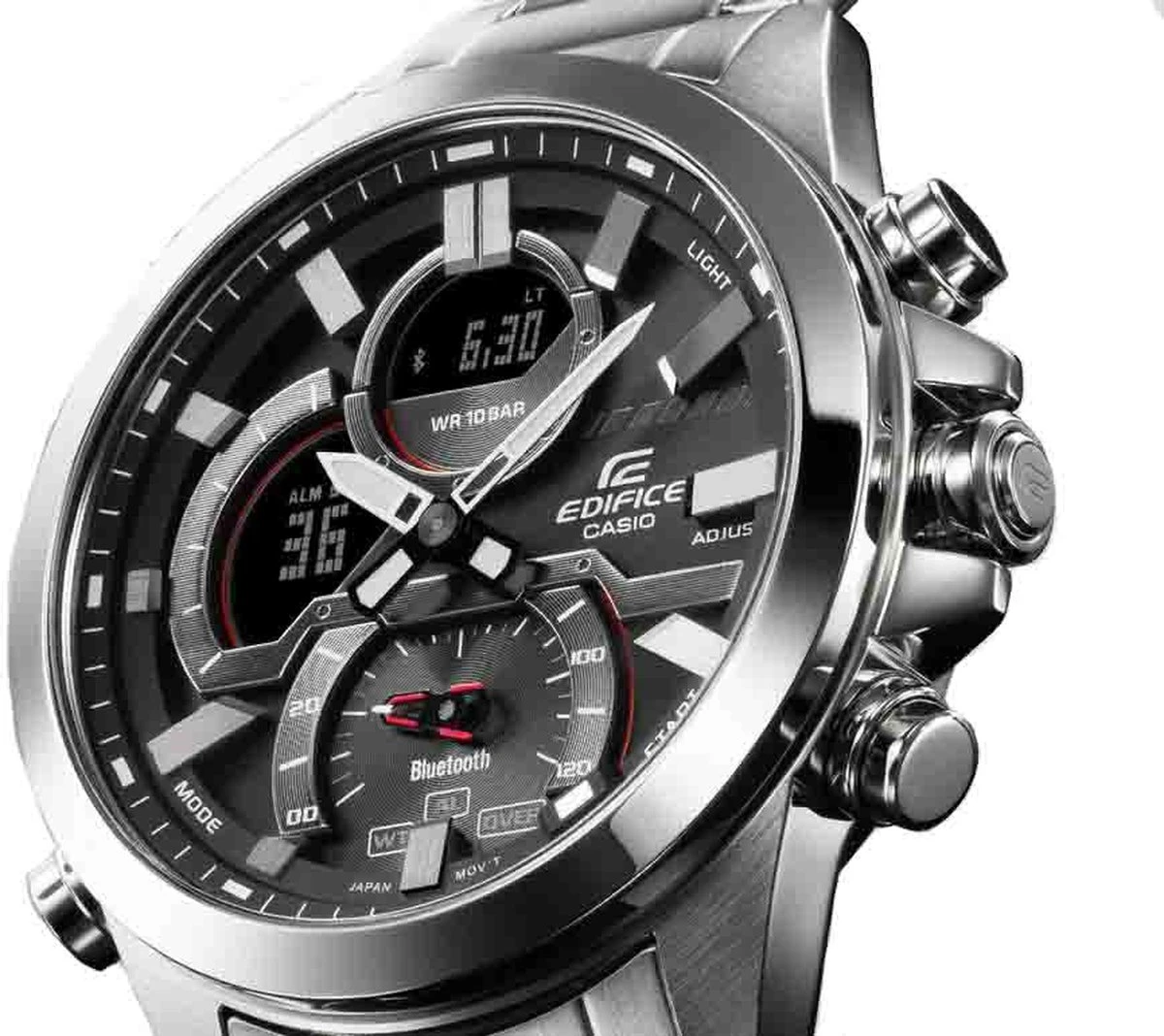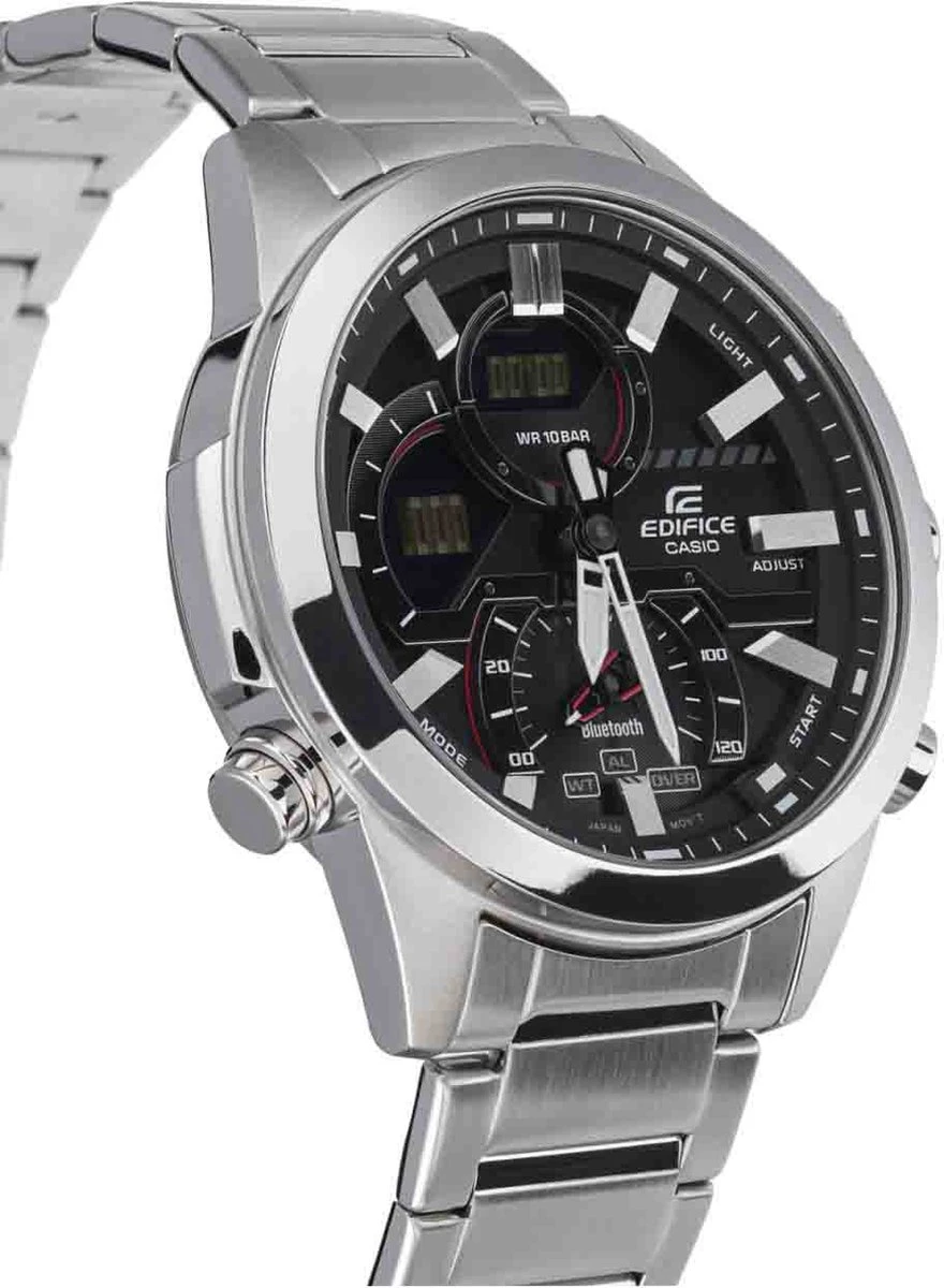 Dit is de ECB-30D-1AEF horloge van Edifice. Het horloge heeft een Quartz uurwerk. De wijzerplaat is Zwart en is afgedekt met Mineraalglas. De kast is gemaakt van RVS en heeft een diameter van 49 mm. De band van het horloge is Zilverkleurig en gemaakt van RVS. Van dit horloge heb je jarenlang draagplezier!