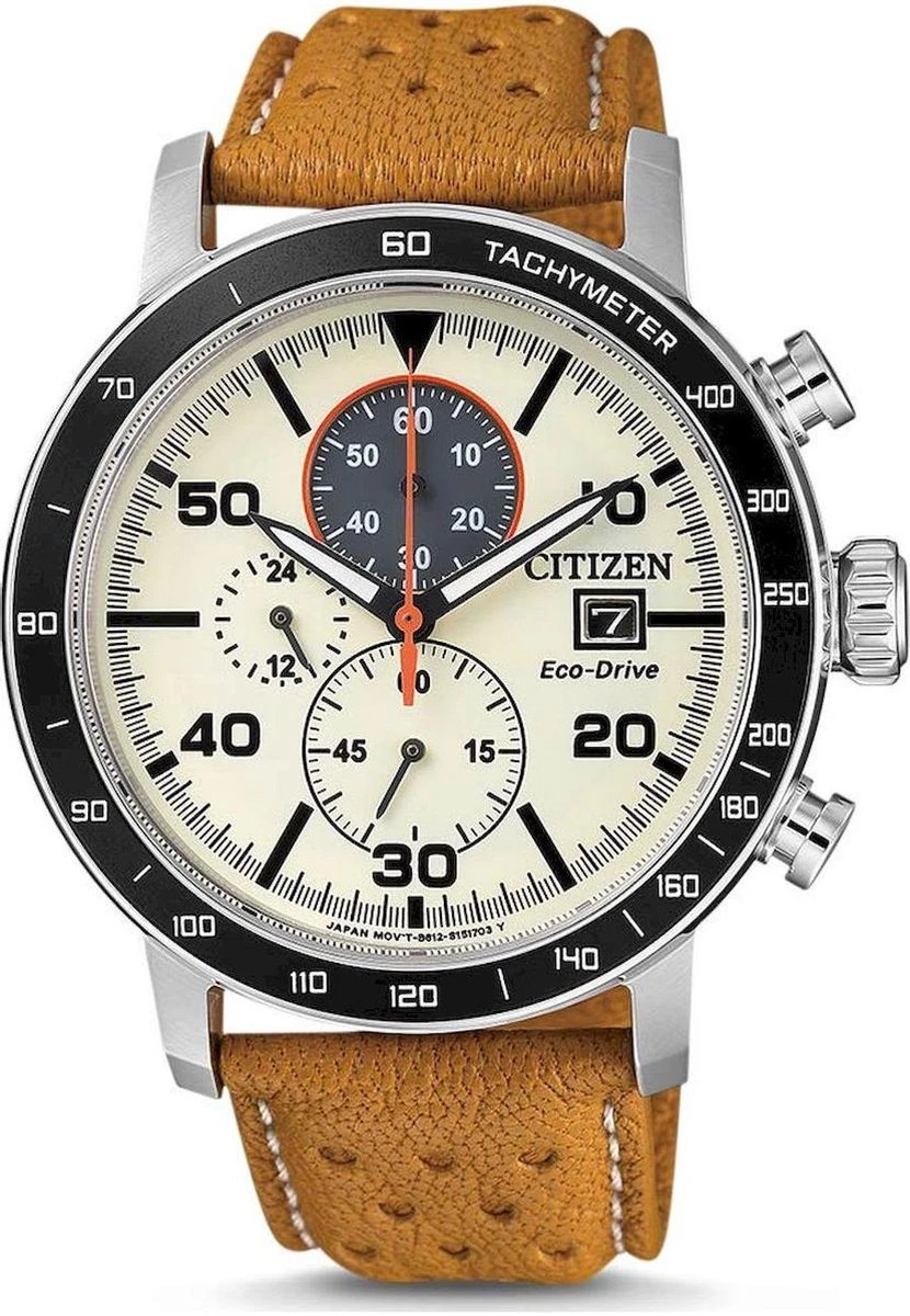 Eco-Drive,24-Uur aanduiding, Eco-Drive aandrijving, Datum, Stopwatch:max.60 Min,1/5 Sek,,Pin Buckle