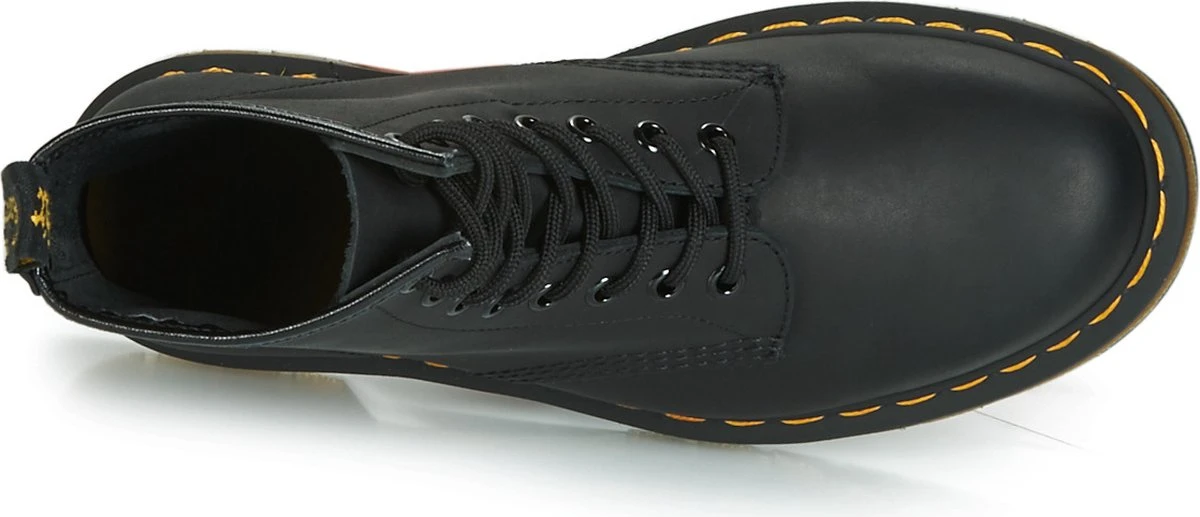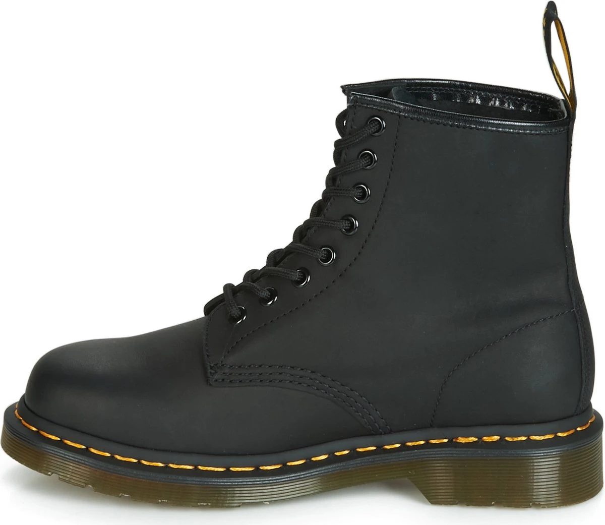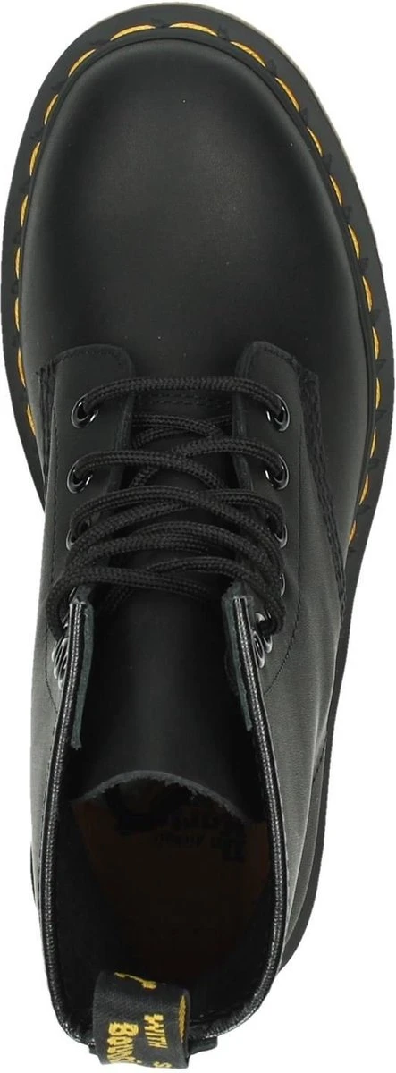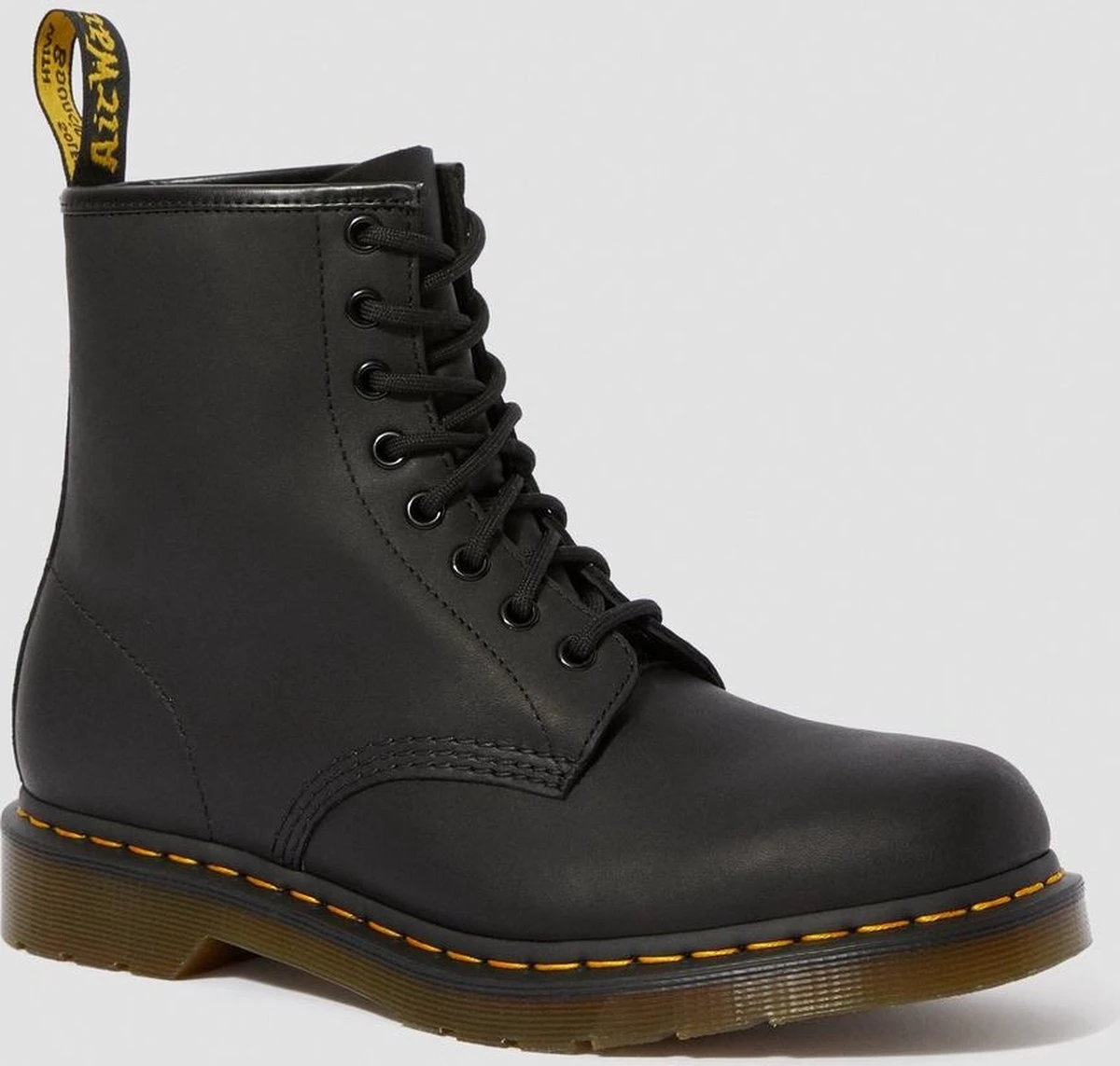Deze volledig van leer gemaakte Dr. Martens boot heeft de kenmerkende gele stiksels in de stoere zool.