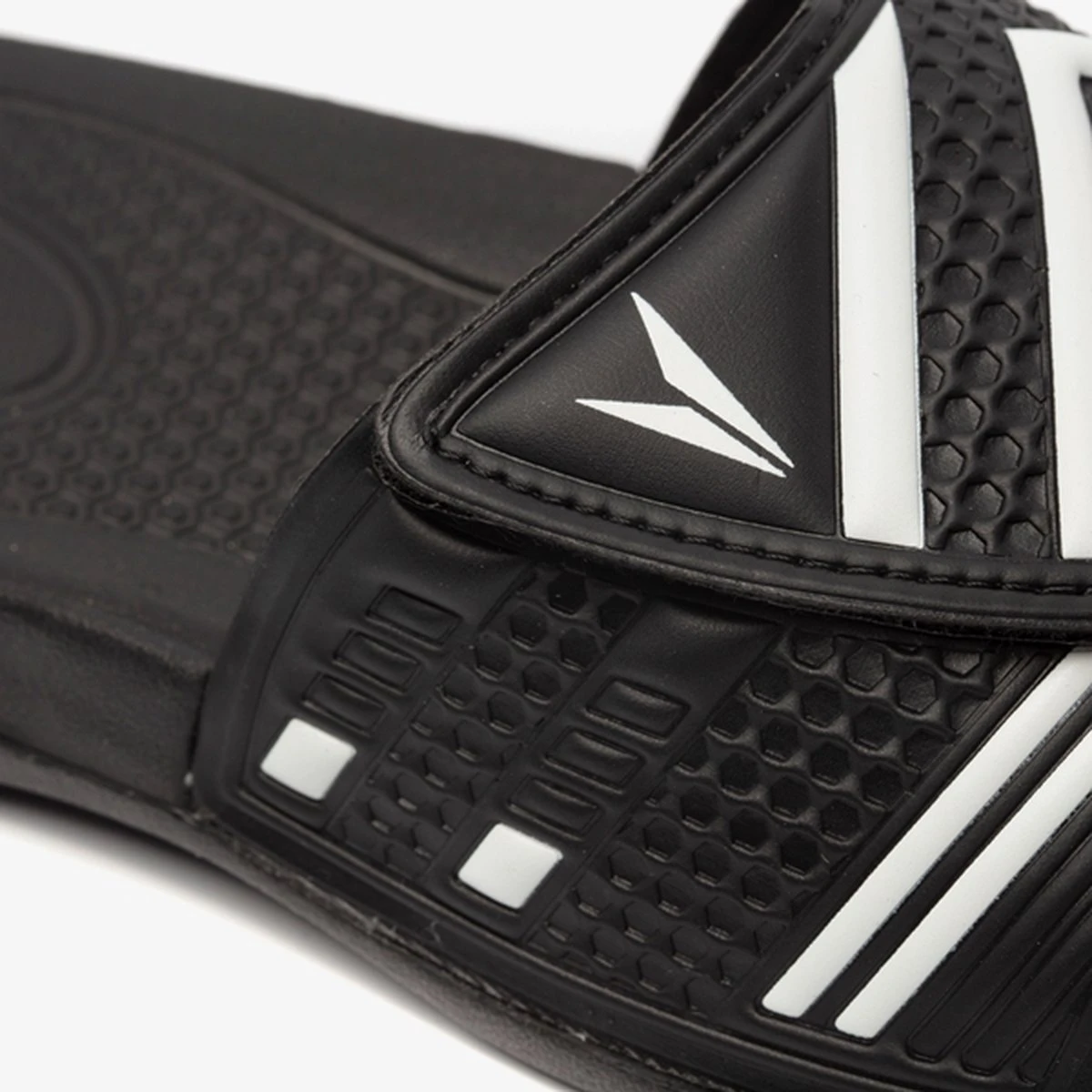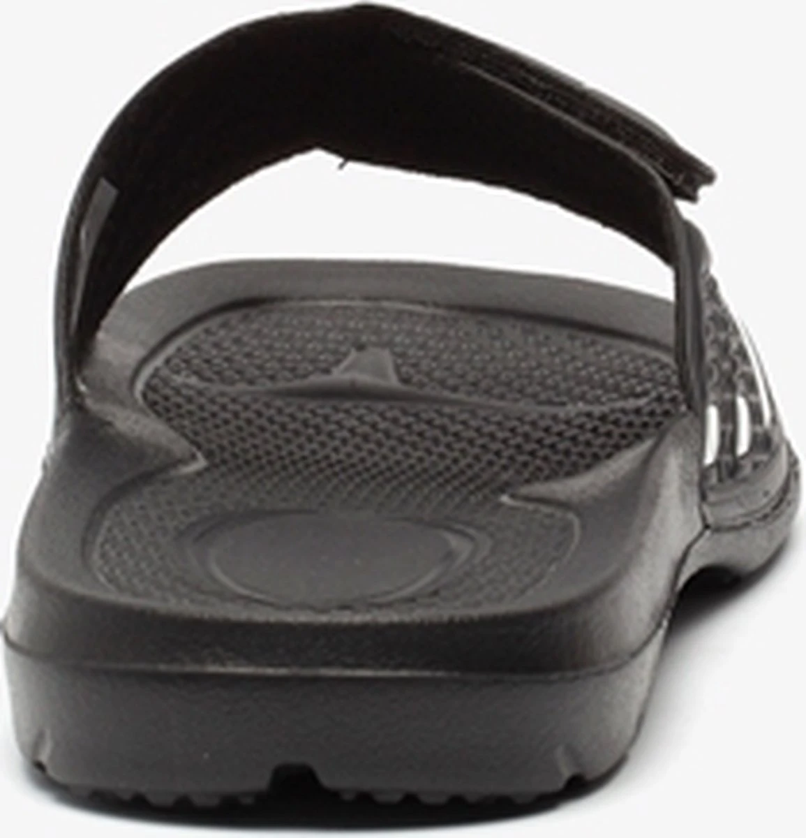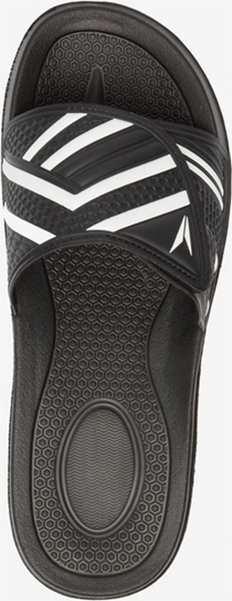 Zwarte badslippers voor heren van Dutchy. Gemaakt van synthetisch materiaal en voorzien van een stevige profielzool van rubber. De saunaslippers hebben een comfortabel voetbed en brede teenband met klittenbandsluiting voor een optimale pasvorm. Voorzien van witte merkaccenten op het bovenwerk.