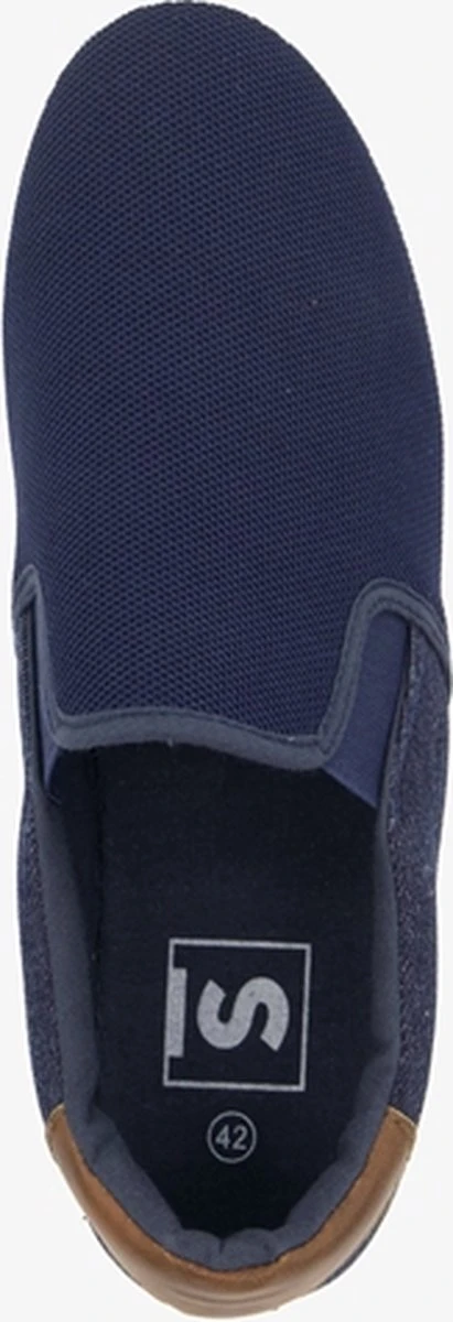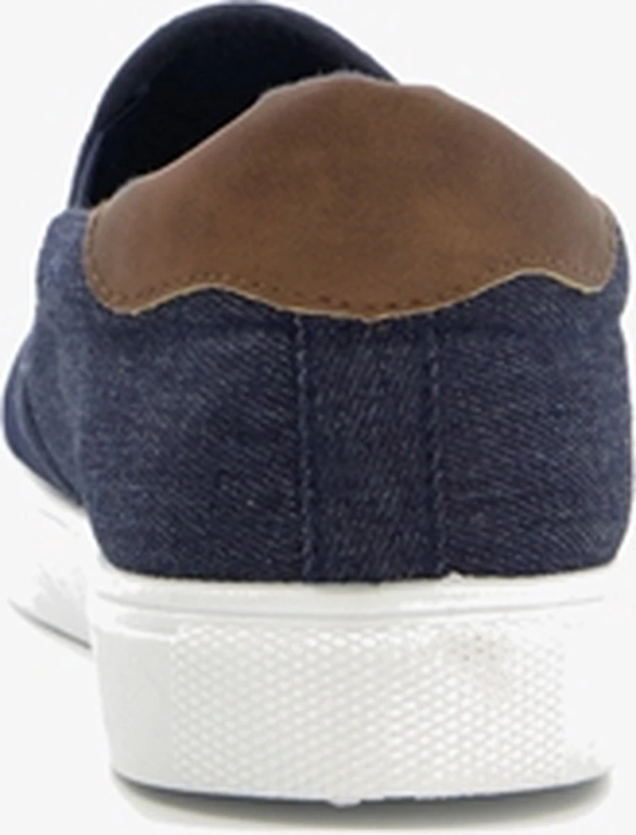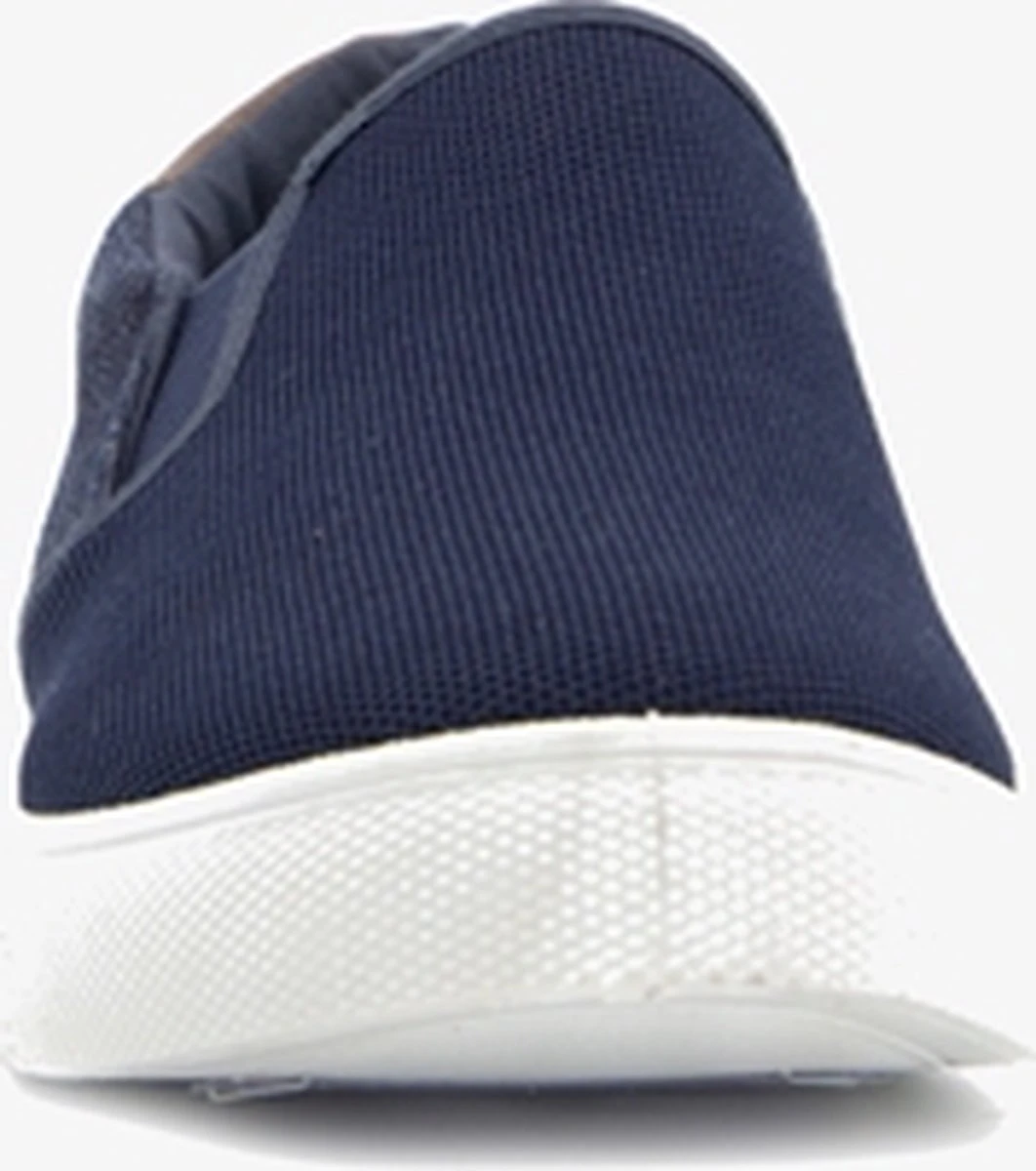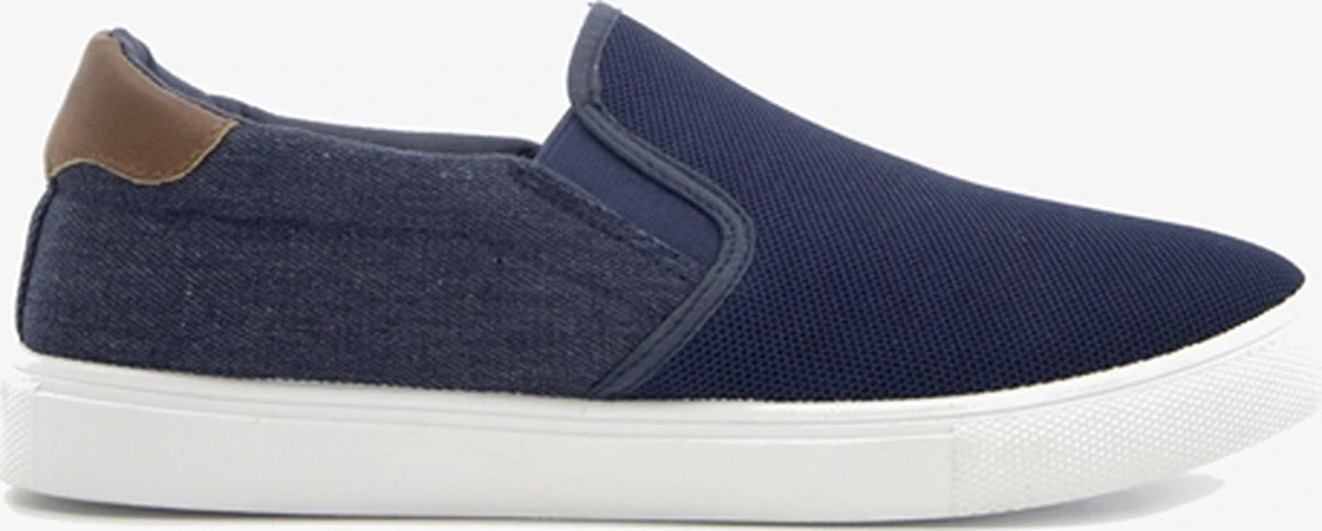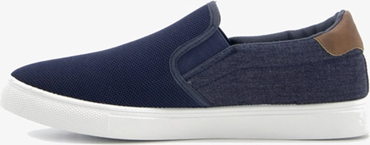 Zwarte instappers voor heren. Gemaakt van textiel, een binnenwerk van textiel en een stevige profielzool. De schoenen hebben elastische inzetjes wat zorgt voor een makkelijke instap. Het comfortabele voetbed is gemaakt van textiel. Deze is niet uitneembaar. Voorzien van cognac bruine accenten op de hak en een stevige loopzool.