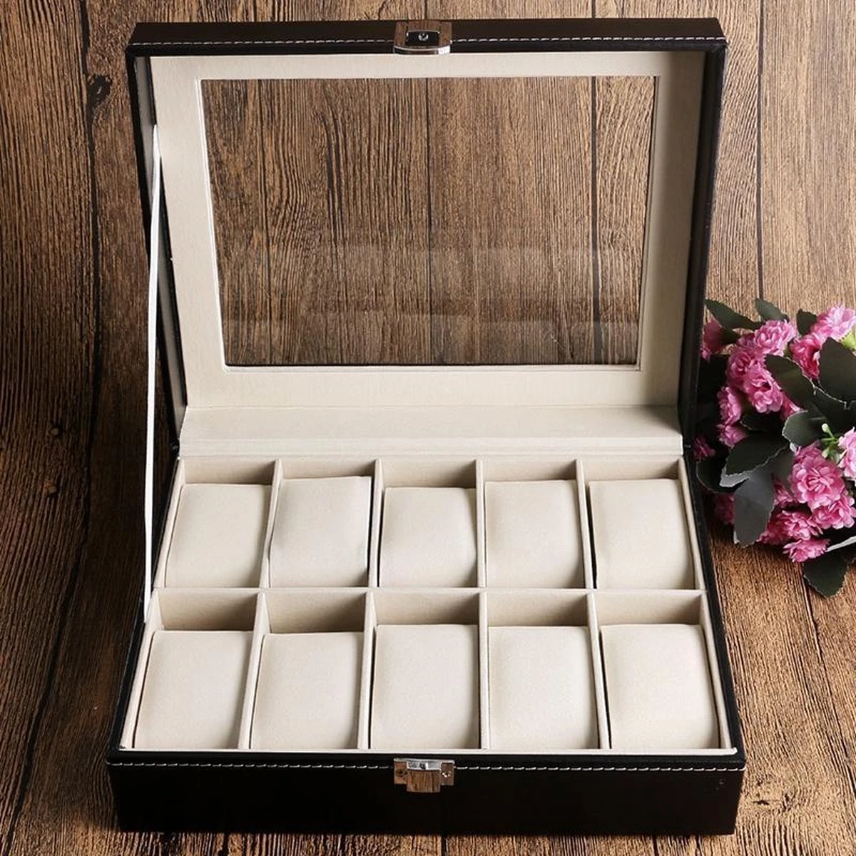 Horloges zijn erg gevoelig voor stof en na verloop van tijd kunnen horloges slechter gaan werken. Met deze horlogedoos bescherm je je horloges op een passende wijze tegen deze kwalijke invloeden. De horloges liggen niet langer open en bloot op het nachtkastje, maar zijn veilig weggeborgen in de horloge box. Met het deksel sluit je de doos stofvrij af.
