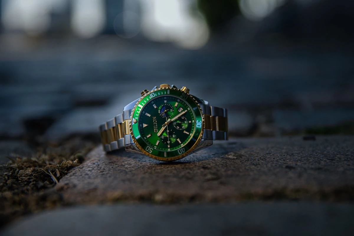 - Elegante kleuren – Het horloge heeft een opvallend uiterlijk met een goud- en zilverkleurige band gecombineerd met een groene wijzerplaat.