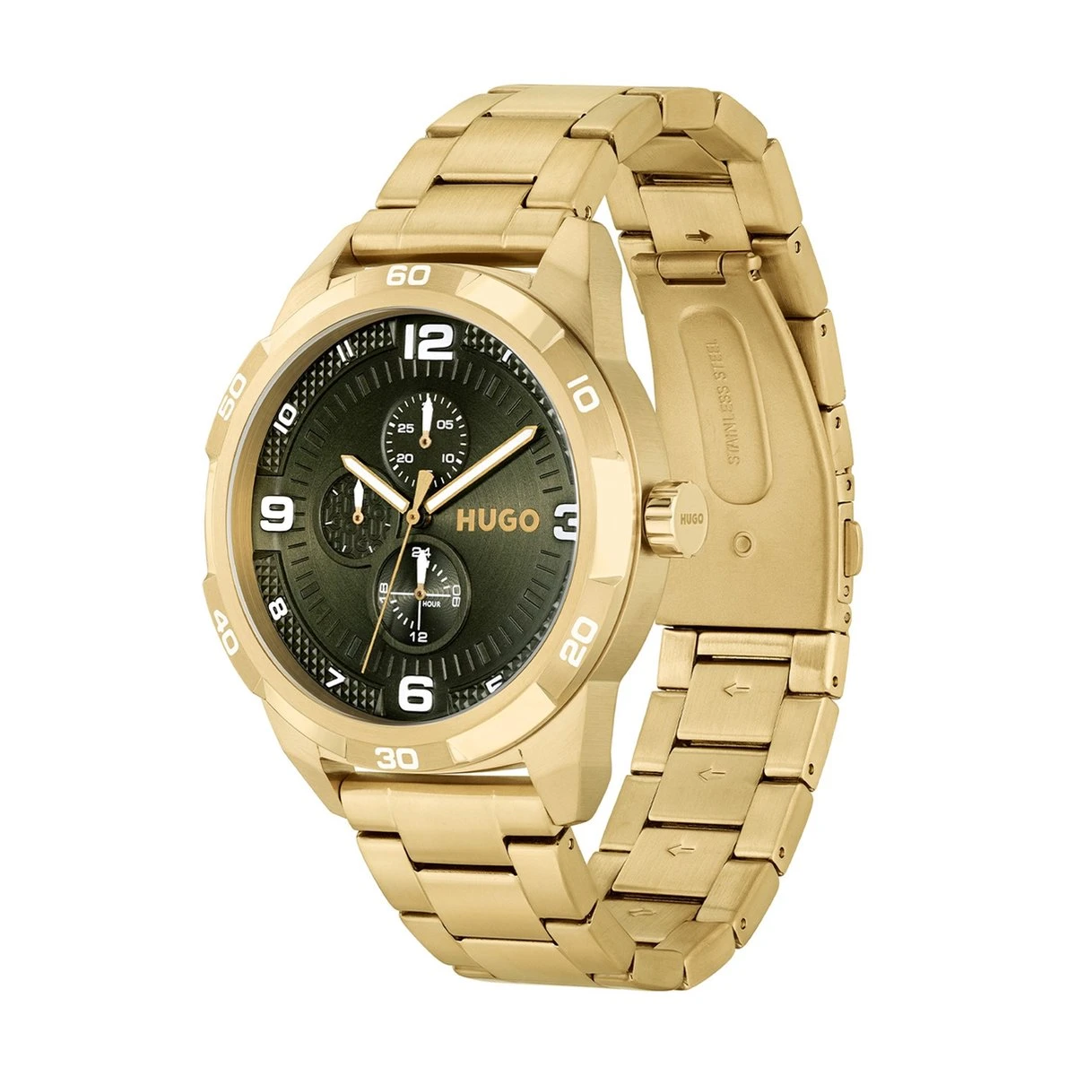 – Horlogeband gemaakt van roestvrijstaal, in de kleur goud, met vlinder- of vouwsluiting