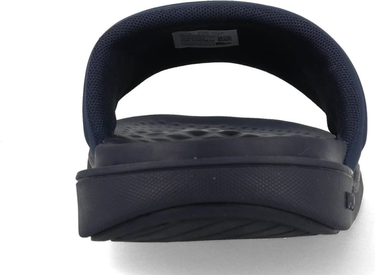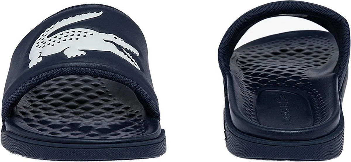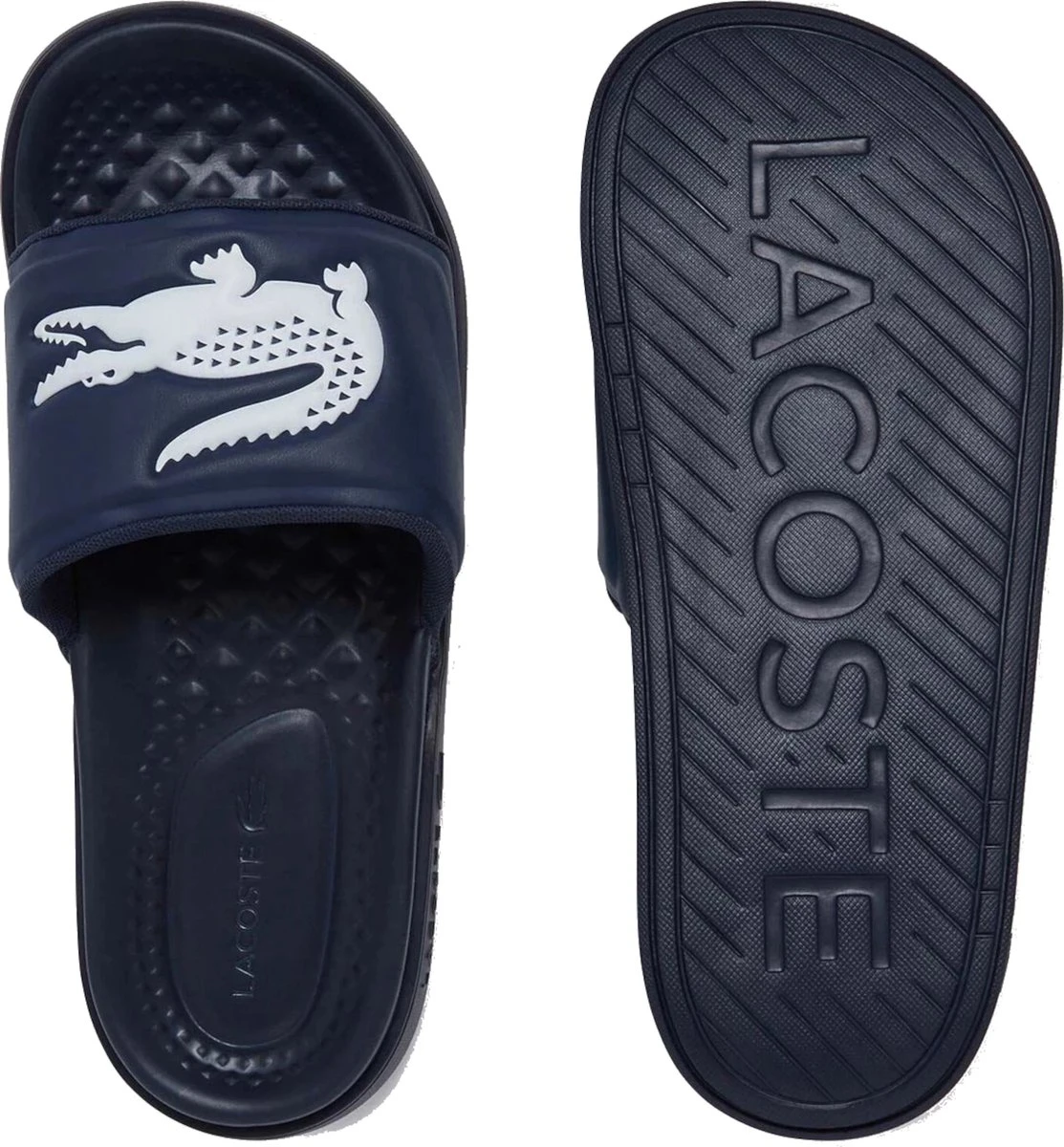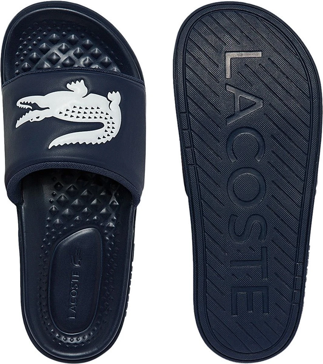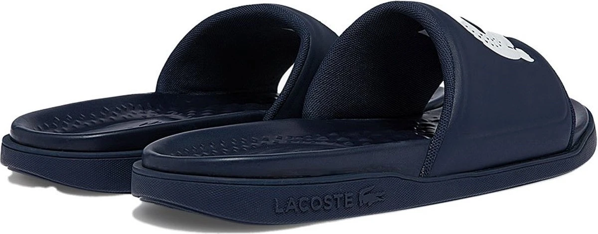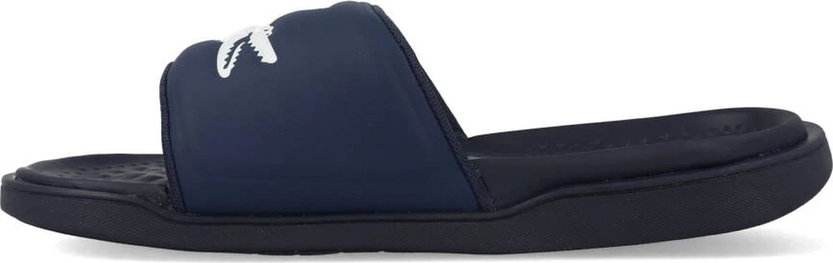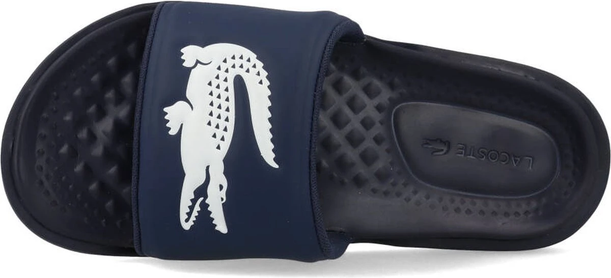 Lacoste Croco dualiste slide badslipper Navy white De Lacoste slide is een slide voor heren is gemaakt van een synthetisch materiaal, rubberen zool, stof en synthetische voering, oversized krokodillenprint op de banden. Deze slide heeft ene mooi voorgevormd en zacht voetbed. Eigenschappen: * Rubberen band * PU-buitenzool * Synthetische voering * Oversized contrasterend gekleurd krokodillenlogo op de band * cushion zool * 100% kunststof