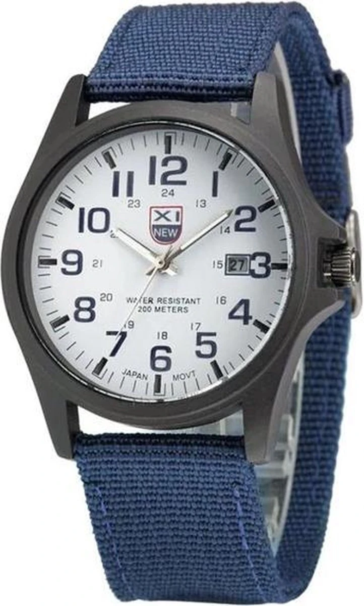 Het horloge heeft een stevige nylon band welk met een gesp is te verstellen, een datumaanduiding en lichtgevende wijzers.