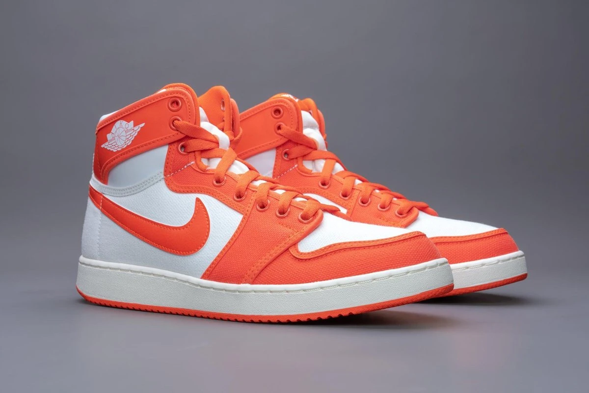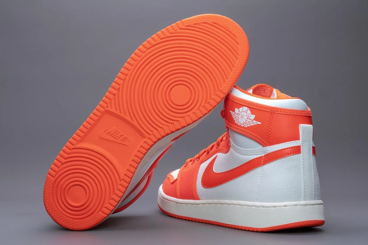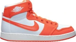 The Air Jordan 1 Retro AJKO Syracuse is a retro version of the iconic Air Jordan 1 sneaker, it features a white leather upper with orange and white accents, inspired by the Syracuse University basketball team. It has a high-top design and features the classic AJKO design elements like the canvas swoosh and the nylon tongue. it’s a limited edition release.