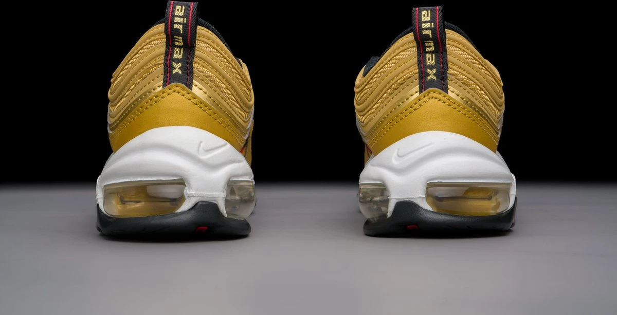 The Nike Air Max 97 OG Golden Bullet (W) is a women’s-exclusive sneaker with a sleek and stylish design. It features a metallic gold synthetic leather upper with red and black accents, inspired by the Japanese Shinkansen high-speed train. The shoe also includes the classic Air cushioning in the sole for comfort and support. It is a unique and eye-catching addition to the iconic Air Max 97 line.