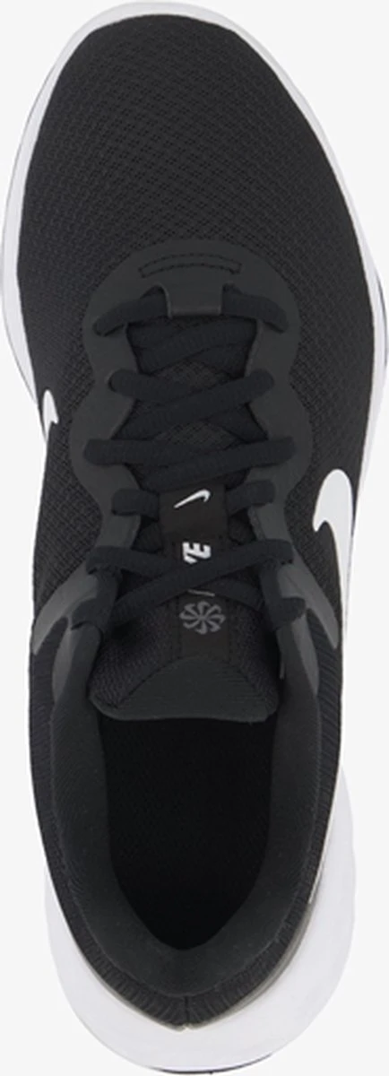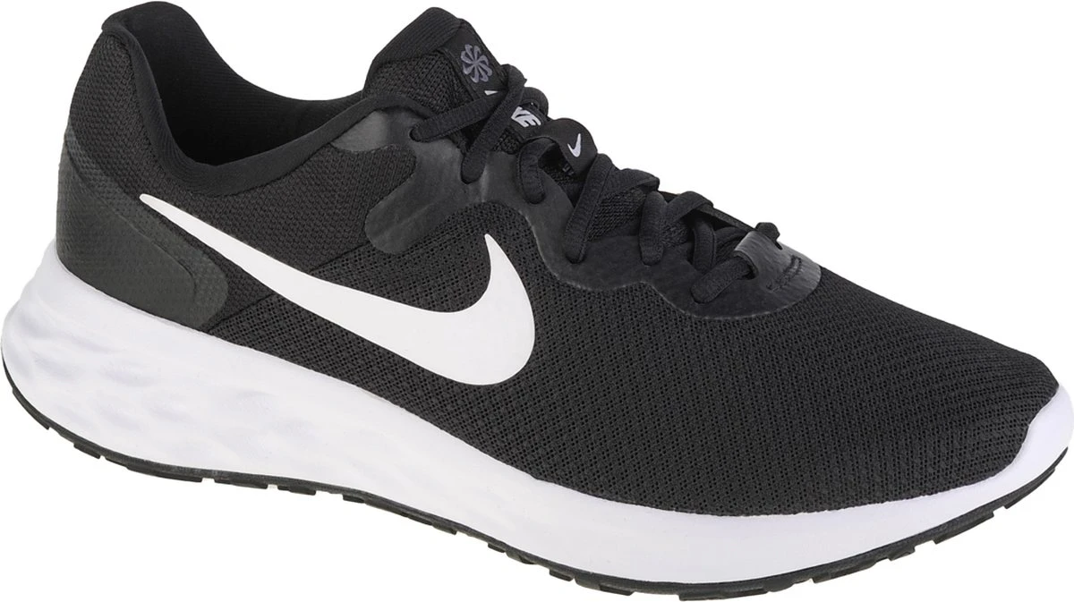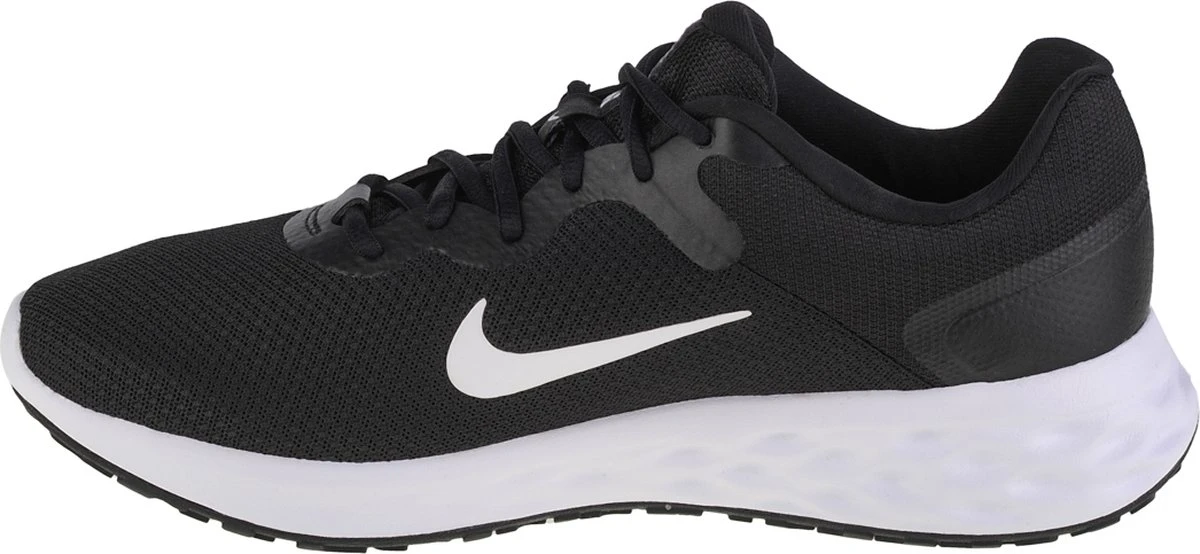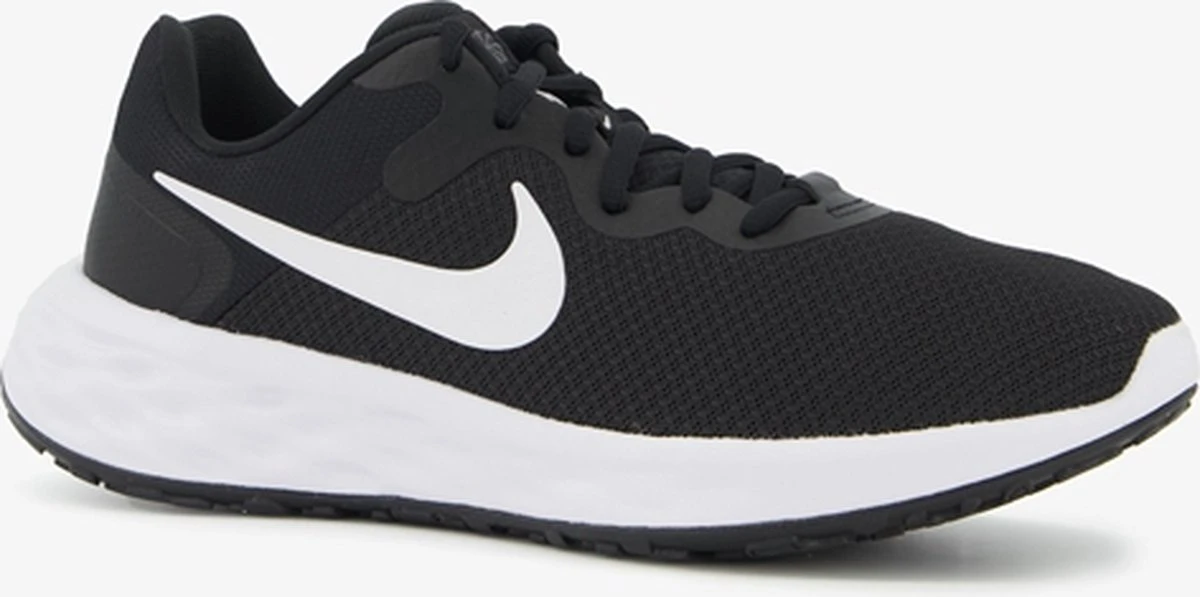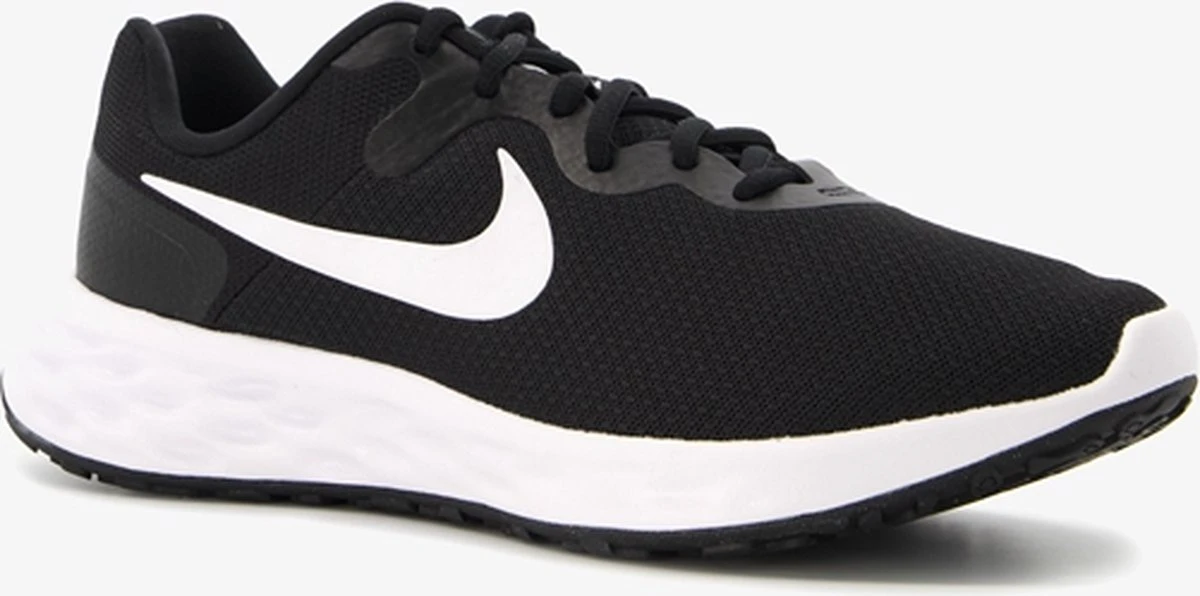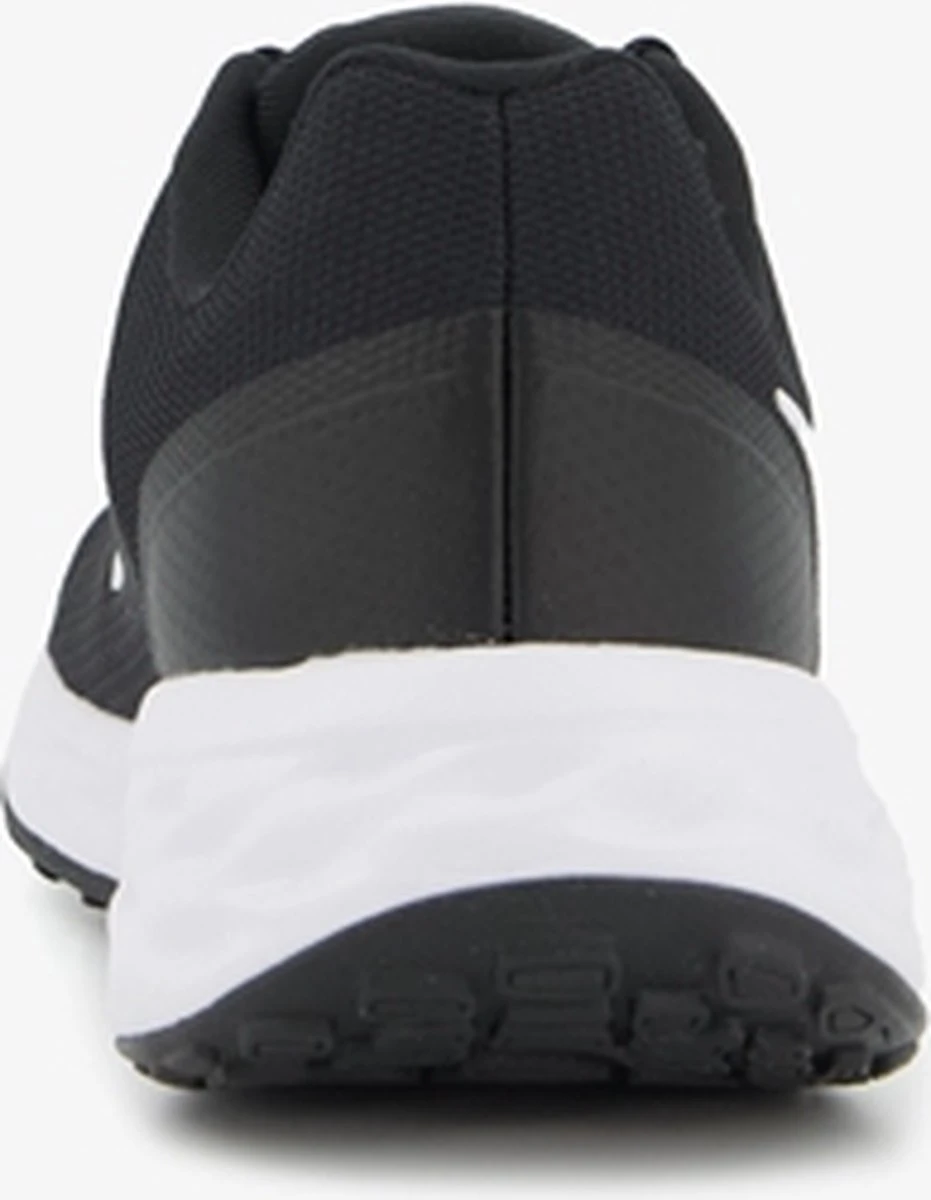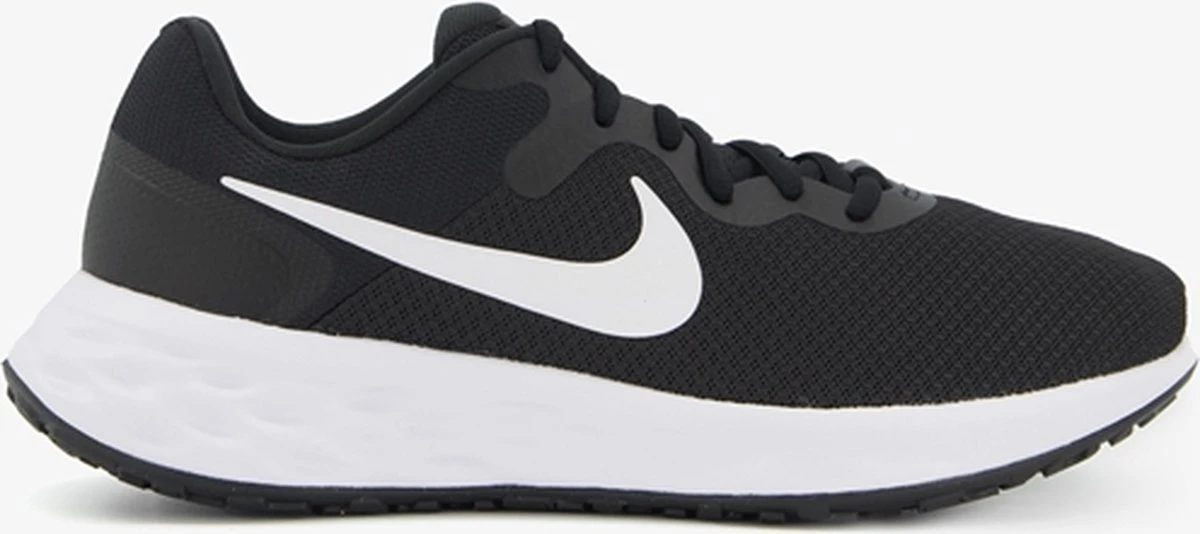 Zwarte Nike Revolution 6 hardloopschoenen voor heren. Gemaakt van textiel, een binnenwerk van textiel en een stevige profielzool. De hardloopschoenen hebben een vetersluiting en comfortabel voetbed van textiel. Het lichtgewicht, mesh bovenwerk sluit aan om de voeten en biedt optimale ventilatie. De verstevigde hiel en overlays zorgen voor ondersteuning en duurzaamheid. Deze mooie hardloopschoenen hebben een dempende middenzool en rubberen buitenzool voor een goede grip op verschillende oppervlakken.