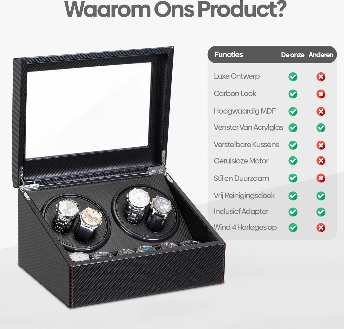 De watchwinder verlengt de levensduur van je horloge. De delen van het uurwerk blijven constant in beweging waardoor de olie in het uurwerk goed verdeeld kan blijven. Je horloges zullen altijd op tijd blijven lopen!