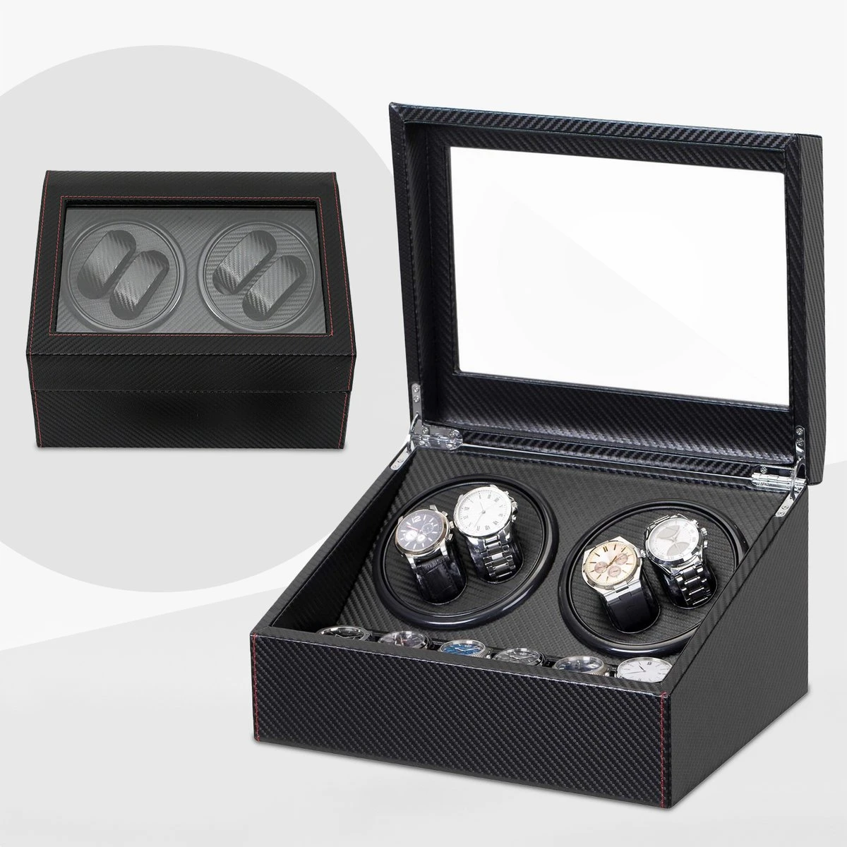 De horloge opwinder draait in twee richtingen rond: zowel links- als rechtsom. Er kunnen 4 horloges gelijktijdig worden opgewind én er kunnen 6 horloges vooraan in de box worden opgeborgen.