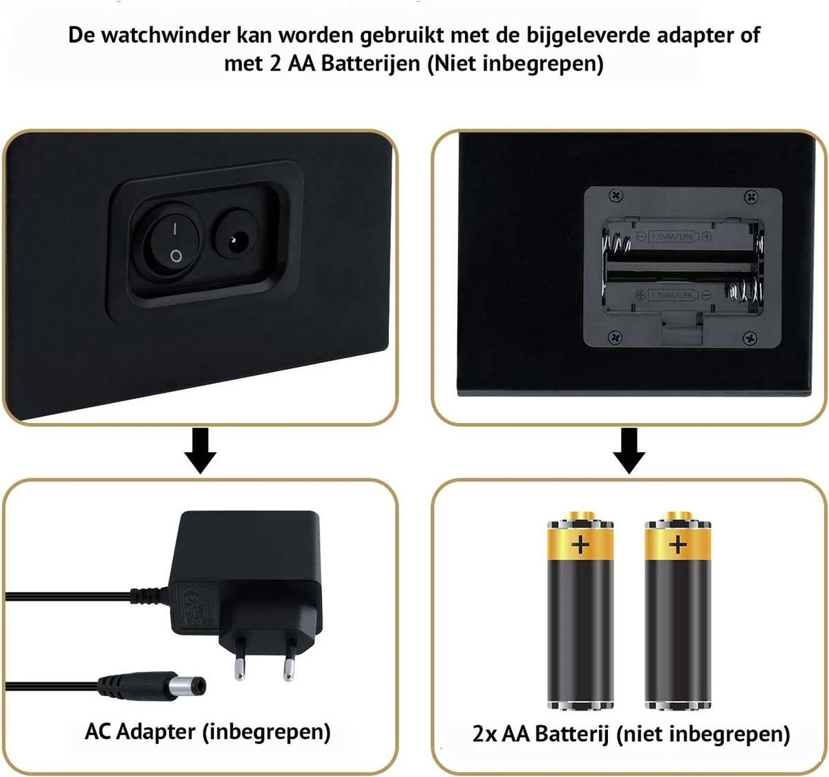De watchwinder kan gebruikt worden met de bijgeleverde adapter of met batterijen (niet inbegrepen).