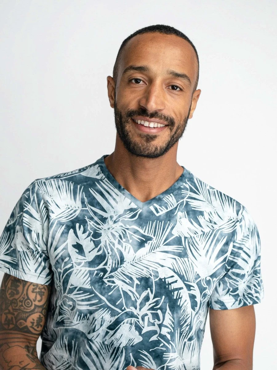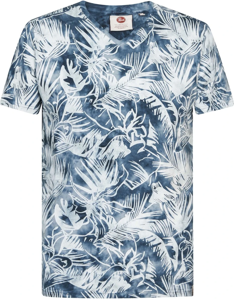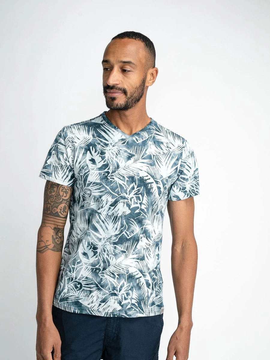 T-shirt met all-over print, V-hals en korte mouwen. Gemaakt van 100% katoen. Twijfel je tussen twee maten? Kies dan de grootste maat.