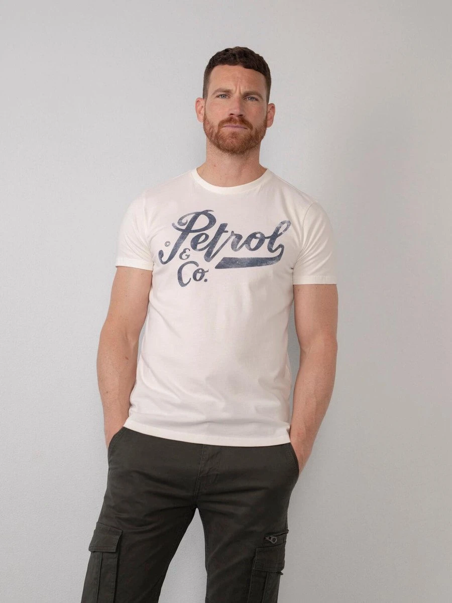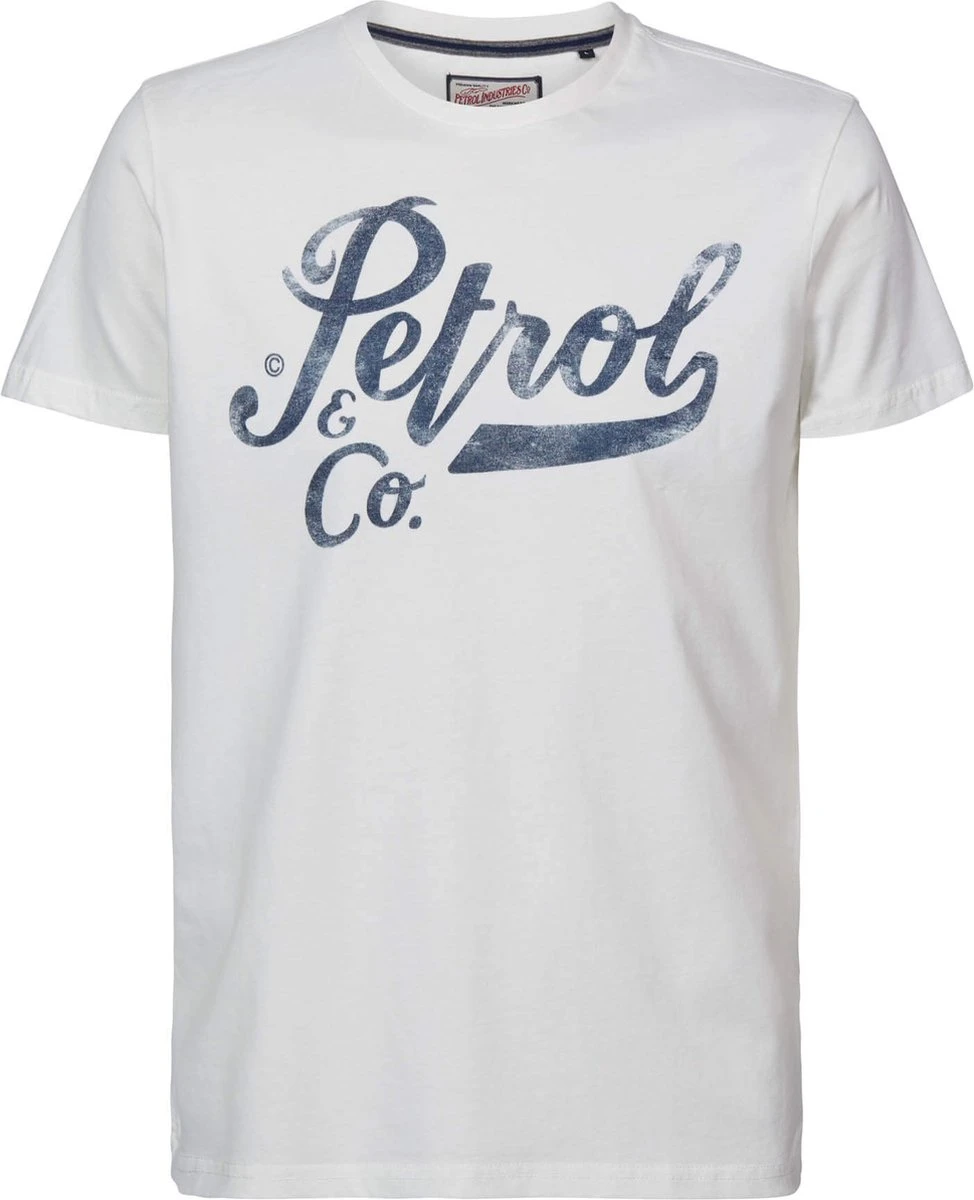 100% katoenen T-shirt met korte mouwen en ronde kraag. Dit T-shirt heeft een effen design met Petrol artwork op de borst. Verkrijgbaar in verschillende kleuren. Twijfel je tussen twee maten? Kies dan de grootste maat.