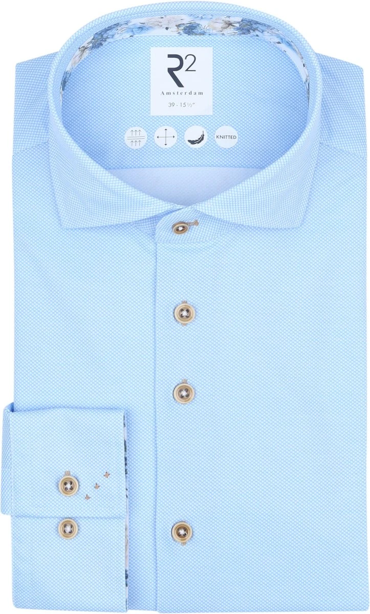 De overhemden van R2 Amsterdam worden gekenmerkt door hun hoge kwaliteit, modische details en trendy twists. Dit overhemd heeft een modern-fit pasvorm en zorgt ervoor dat het shirt licht getailleerd langs je lichaam valt. Het overhemd is afgewerkt met een widespread kraag en contrasterende knopen. Daarnaast is het overhemd gemaakt van katoen en polyester, waardoor het zacht aanvoelt, een natuurlijke stretch krijgt en comfortabel draagt. Blauwe kleurLicht getailleerde Modern-Fit pasvormGemaakt van 47% katoen en 53% polyesterKnittedAdemendStretchZacht