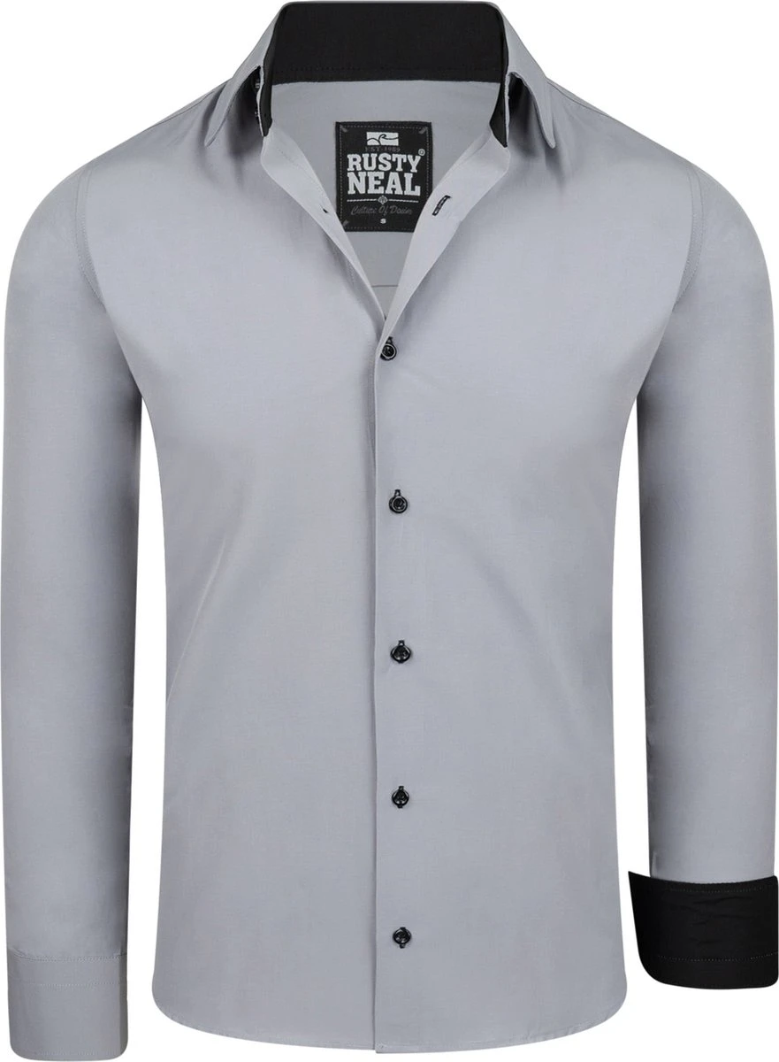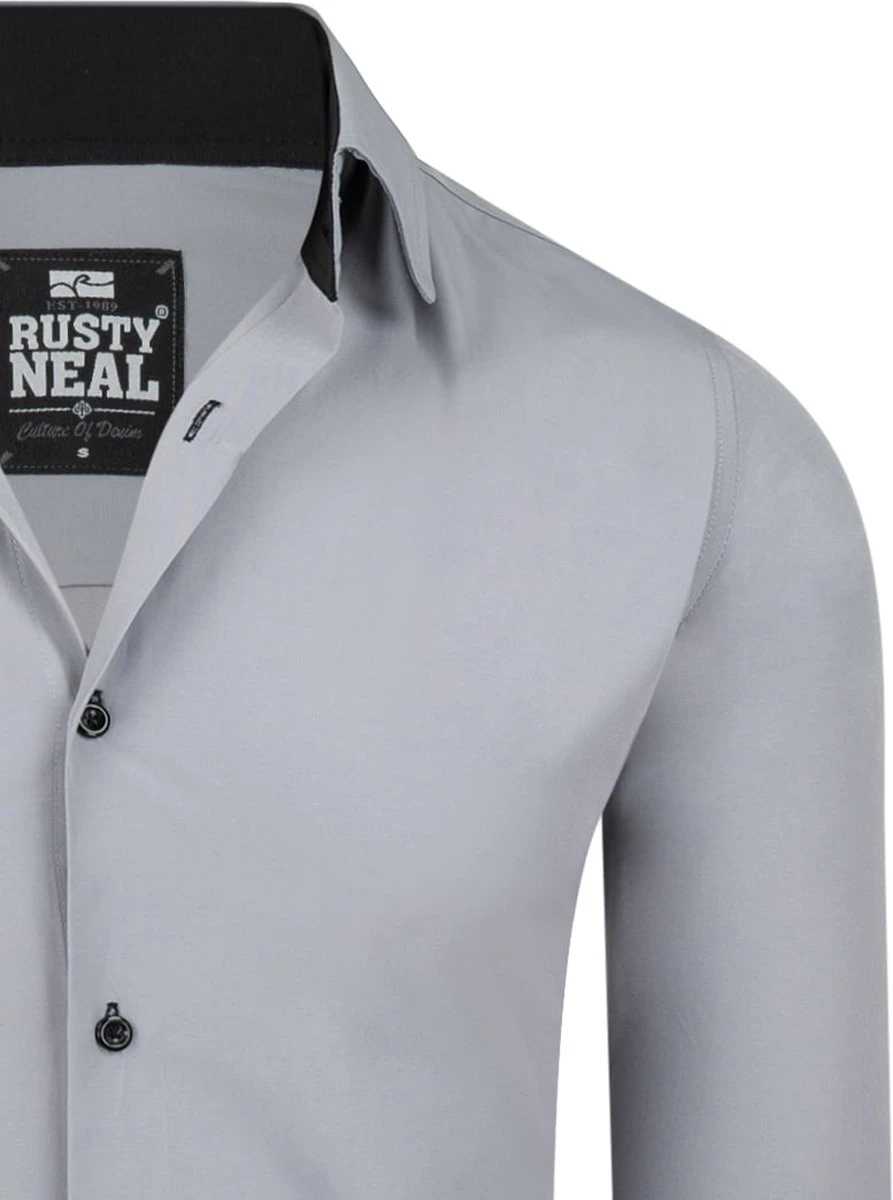 Grijs heren overhemd van het merk Rusty Neal. Deze nette slim fit overhemden hebben een zakelijke uitstraling, maar zijn ook zeer geschikt als vrijetijdskleding. Het grijze effen overhemd heeft een slim fit pasvorm. Bij twijfel adviseren wij u een maatje groter te bestellen. De blouse is voorzien van een zwarte binnenboord en zwarte knopen.Materiaal: 60% katoen, 37% Polyester, 3% ElastanKleur: Grijs zwart..