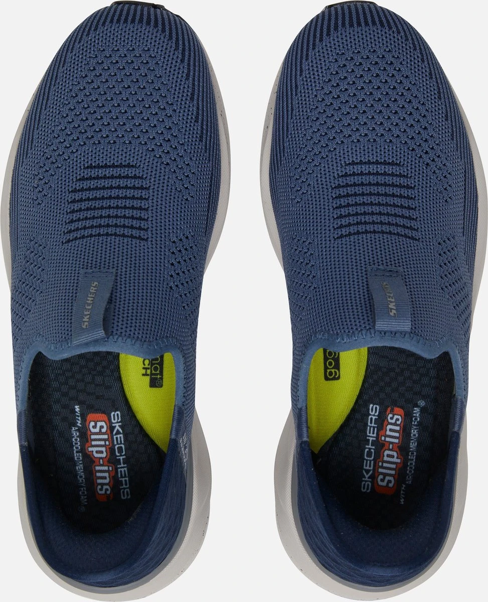Deze Skechers Bogdin instappers in de kleur blauw zijn gemaakt van textiel. De voering en de comfortabele binnenzool zijn ook van textiel. De zool is gemaakt van rubber en heeft een dikte van 2 centimeter.