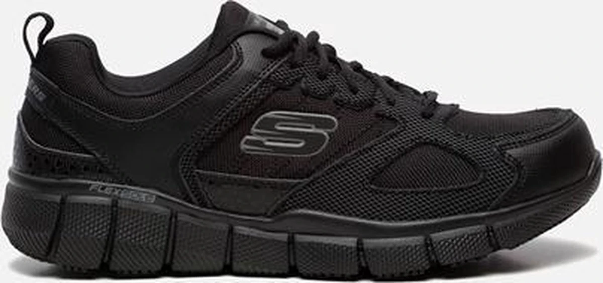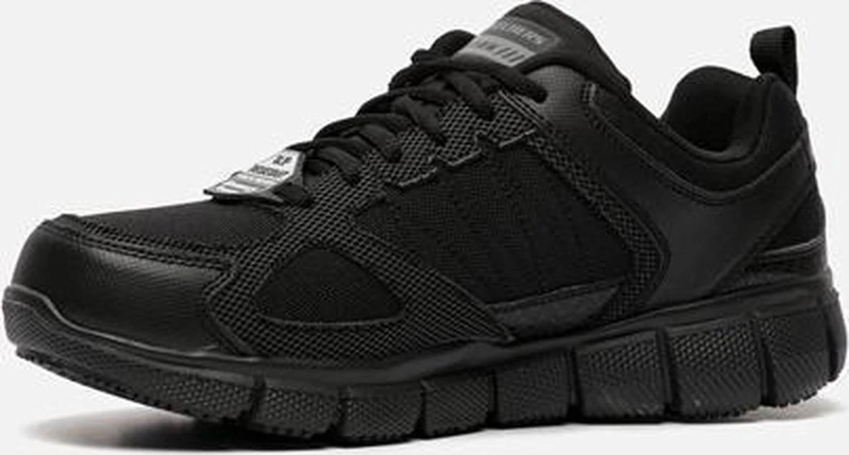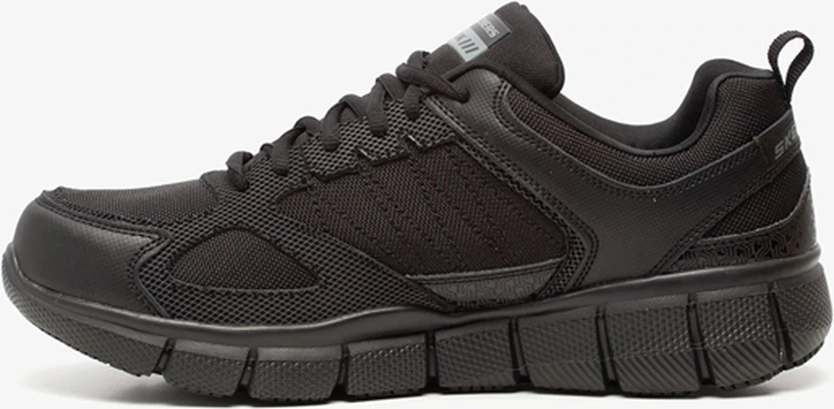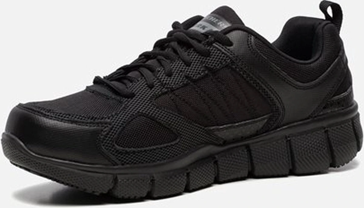 De zwarte Skechers Work Telfin Sanphet SR sneakers zijn stevige werkschoenen met een sportieve look. Dit model is gemaakt van glad leer en heeft een voering en binnenzool van textiel. Dankzij de Memory Foam binnenzool lopen de schoenen enorm comfortabel en geniet je van demping bij iedere stap. De Relaxed Fit zorgt voor bewegingsvrijheid voor optimaal draagcomfort. Deze werkschoenen hebben een classificatie voor elektrisch gevaar (EH), wat betekent dat ze zijn getest door de American Society for Testing and Materials voor hun bescherming tegen elektrische schokken. De rubberen FlexSole biedt grip en flexibiliteit en is voorzien van anti-slip. De zwarte Skechers Work Telfin Sanphet SR sneakers hebben een uitneembaar voetbed.