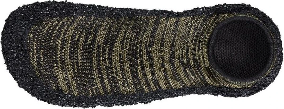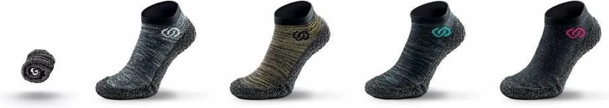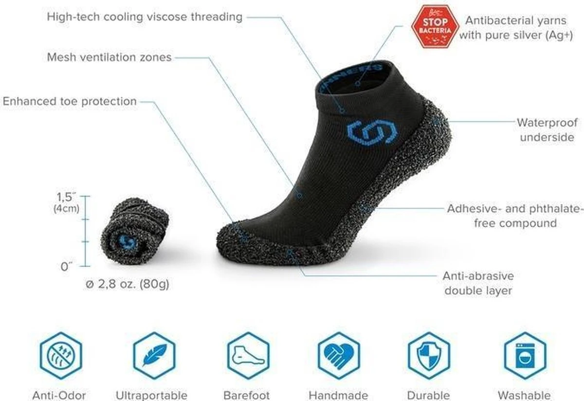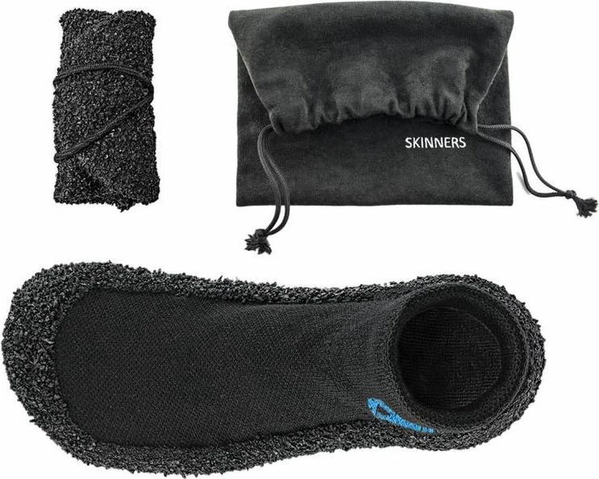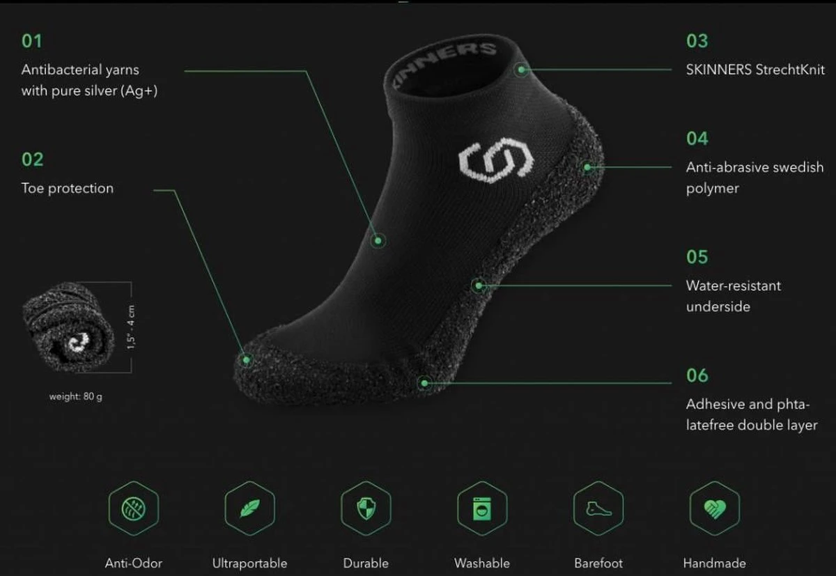 Waterproof, in een nette tas, en oprolbaar, dus echt minimaal om mee te nemen op reis, of naar de sportschool, etc. De bovenkant is een elastische stof, de onderkant een sterke rubber-samenstellng waardoor de voet beschermd wordt. Door het blote-voet concept voel je wel waar je loopt, maar past de sok/schoen zich heerlijk naar de voet.