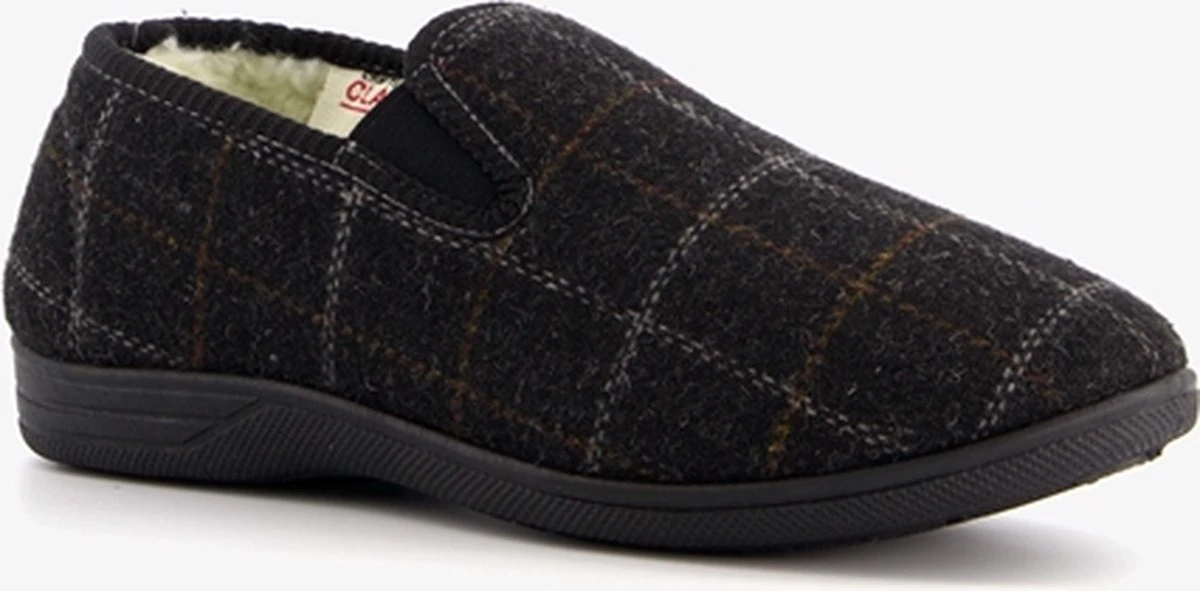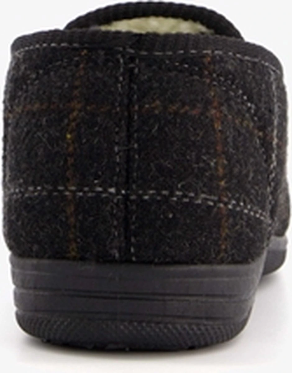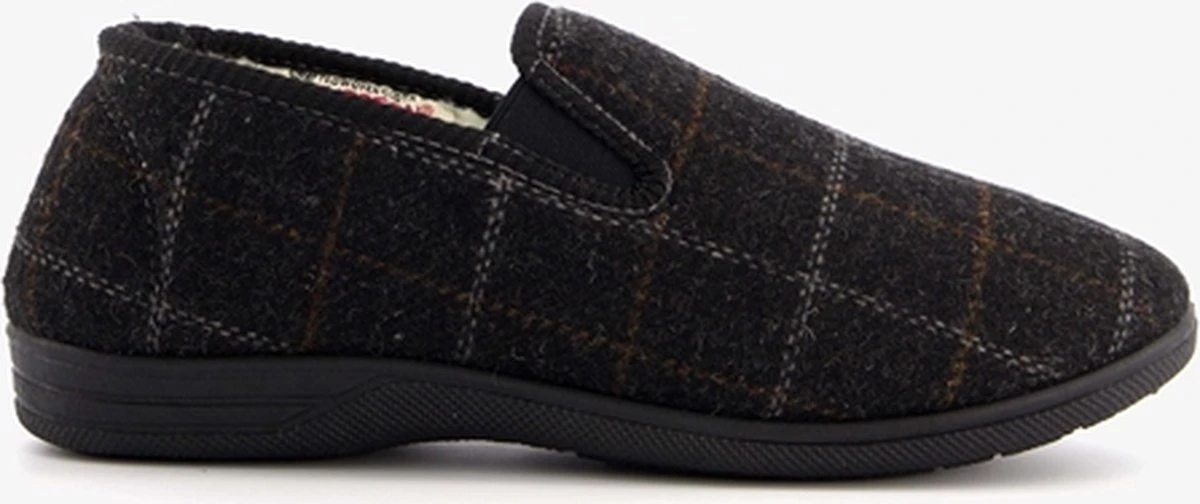 Zwarte, gevoerde pantoffels voor heren uit de Thu!s collectie. Gemaakt van textiel, een binnenwerk van textiel en een stevige profielzool. De pantoffels hebben een warme voering en een comfortabel voetbed. Op het bovenwerk zijn ruitjes aangebracht.