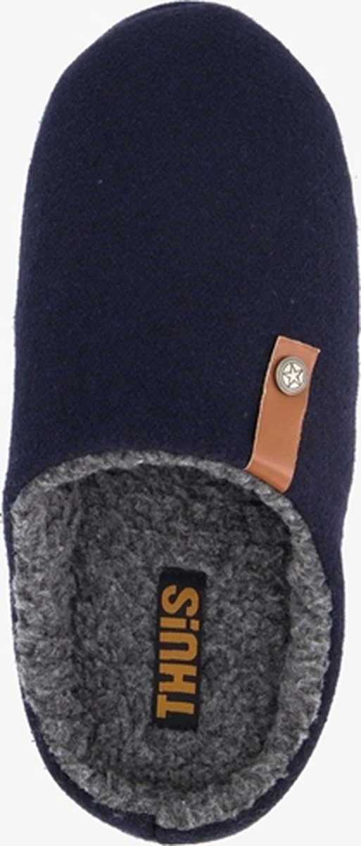 Navy blauwe pantoffels voor heren van Thu!s. Deze mooie pantoffels zijn gevoerd en houden je voeten lekker warm. Gemaakt van textiel, binnenwerk van textiel en een stevige zool van imitatieleer.