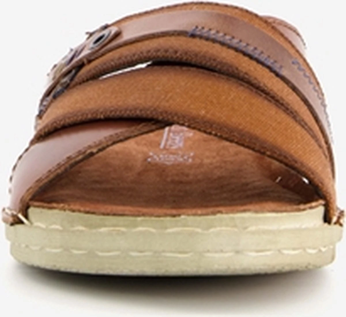 Bruine slippers voor heren uit de Van Beers collectie. Gemaakt van leer, een binnenwerk van textiel en een stevige zool. De slippers hebben een brede cross-over teenband en een comfortabel voetbed van leer met een zachte overlay. Voorzien van inzetten van textiel op het bovenwerk en een dikke zool van rubber die grip en demping biedt.