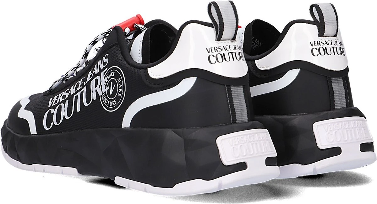 Wil jij met je schoenen een statement maken? Dan zit je met deze lage sneaker Fondo Atom Dis. 22 van het merk Versace Jeans helemaal goed! Het bovenwerk is uitgevoerd in zwart, geweven textiel in combinatie met witte, rubberen accenten. Opvallend is de sportieve vorm, de grote merkopdrukken op de tong, zijkant en hiel, het textiele aantreklusje op de hiel met transparante bies en de chunky zool met 3D vormen en wit merkembleem. Extra tof zijn de zwart met witte veter die is voorzien van een rode trekkoordsluiting en paars veterplaatje. De gewatteerde enkelkraag en tong zorgen samen met de textiel voering en het uitneembare voetbed voor een optimaal comfort. De rubberen zool is licht van gewicht en draagt daardoor ook zijn steentje bij aan een fijn loopcomfort. Het grove profiel onder de witte loopzool biedt je een uitstekende grip en stabiliteit.