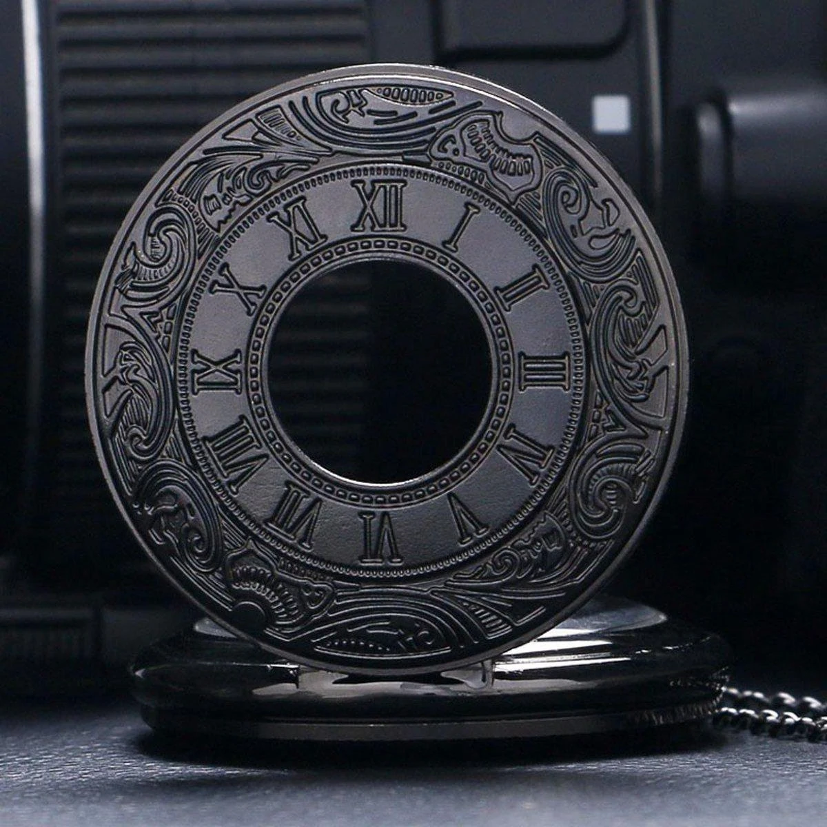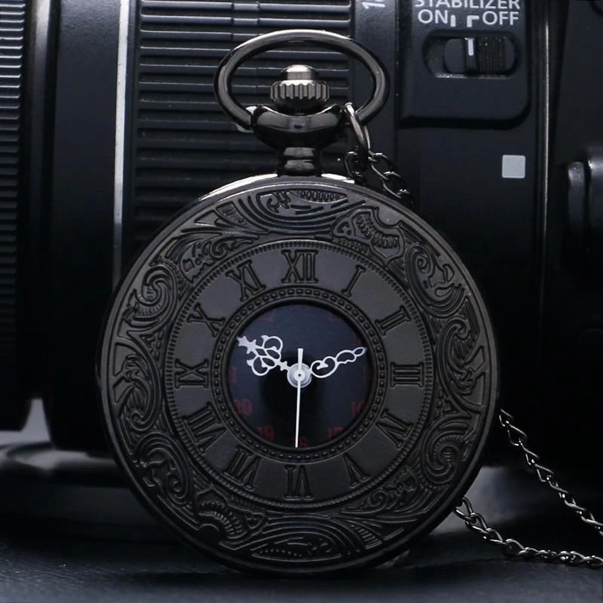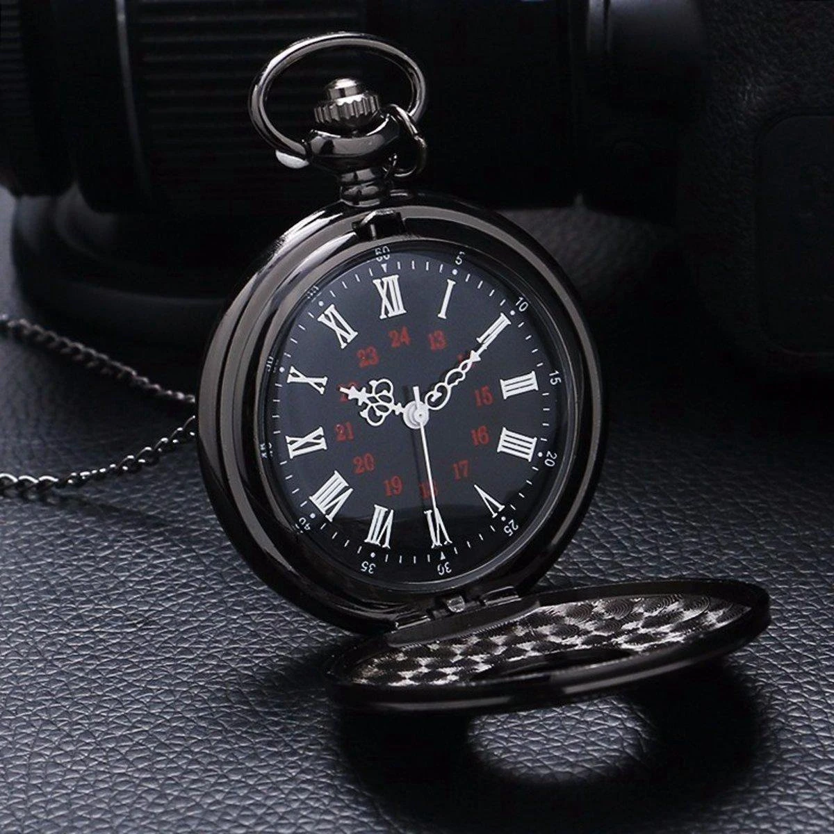 De tijd kunt u instellen door de draaiknop aan de bovenkant van het zakhorloge omhoog te trekken en vervolgens deze naar rechts te draaien. Wanneer de tijd goed staat drukt u de knop weer naar beneden.