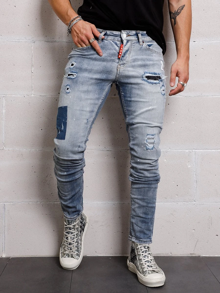 - [FIT GUIDE] Slim Fit Ripped Jeans met halfhoge taille. Ruimer aan de bovenkant en smaller naar de enkel toe. Jeans met taps toelopende pijpen voor heren met vijf zakken. Makkelijk te combineren met tops en schoenen. Probeer een maat groter als je meer van relaxt houdt. Postmoderne jeans met iconische look. Geldig voor alle seizoenen.