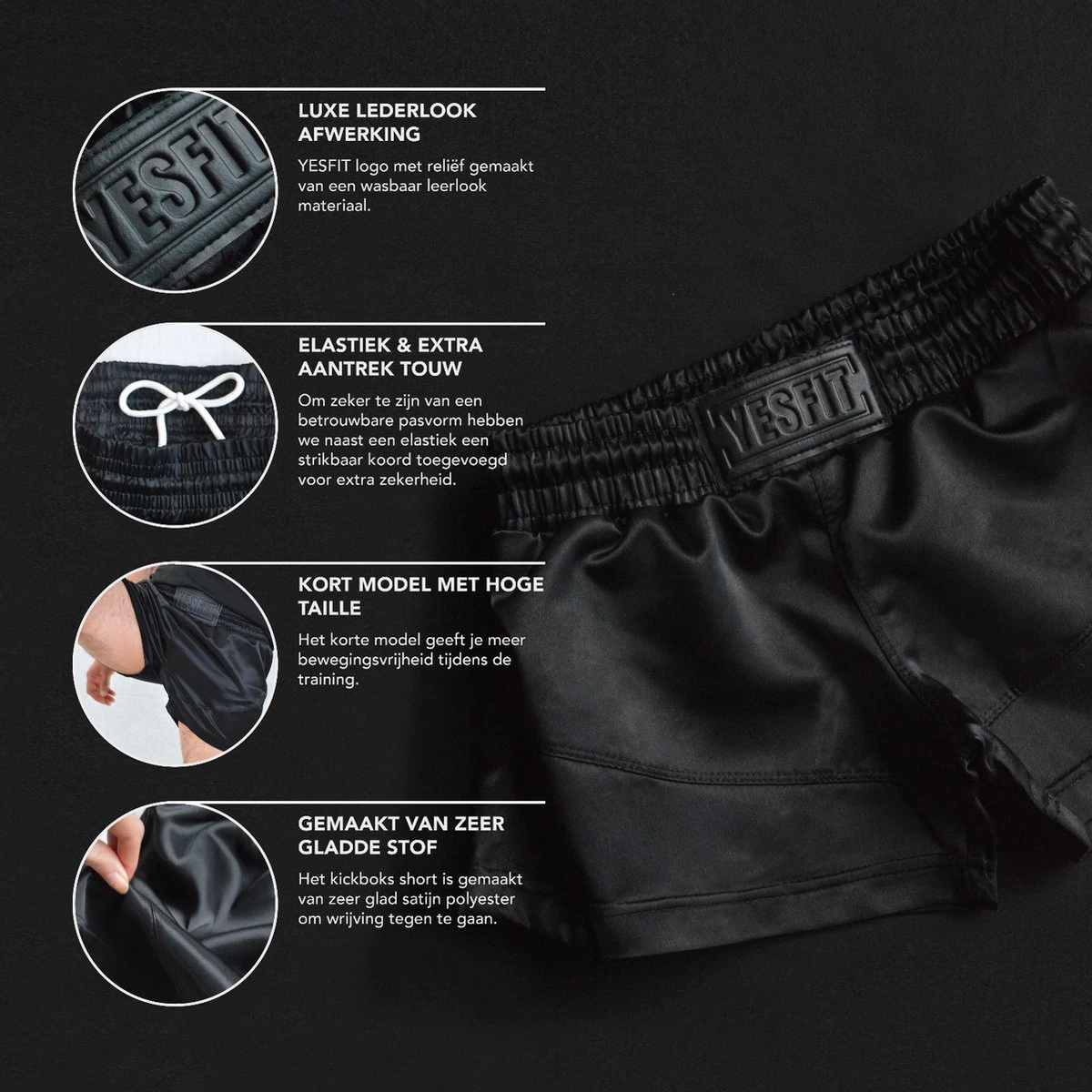 De short maakt deel uit van onze black on black collectie en heeft een luxe afwerking met lederlook logo. Het broekje bied uitstekende bewegingsvrijheid door het korte ontwerp. Aan de binnenkant van de tailleband zit een elastiek en strikbaar koord voor een optimale pasvorm en zekerheid tijdens intensieve trainingen. Het broekje is gemaakt van polyester satijn wat wrijving tijdens de training tegen gaat.